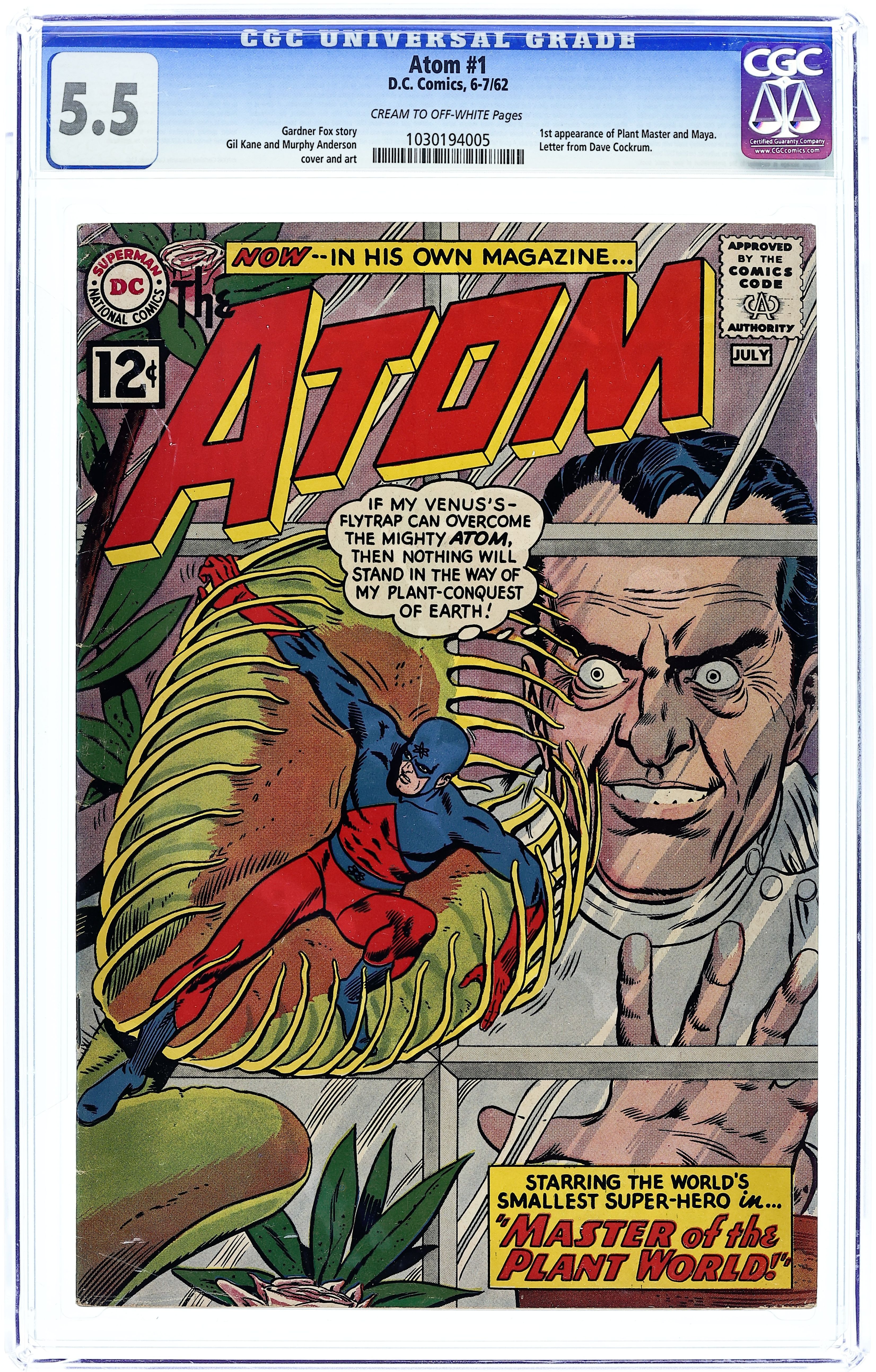 Cover pencils by Gil Kane, inks by Murphy Anderson. "Master of the Plant World!", script by Gardner Fox, pencils by Gil Kane, inks by Murphy Anderson; When a series of mysterious robberies occur which involve strange highly intelligent plants, Ray Palmer decides to investigate as the Atom when he learns about the strange circumstances from Jean Loring; As the Atom, Ray follows Jean as she goes on fact finding about the type of plants that are used, and decides to wait out in a greenhouse to keep a secret eye on Jean; When Jean nods off, Atom notices a group of Dryads that suddenly spring out of the flowers and fly away on petals. Atom follows after them and learns that they are under the control of a criminal called the Plant Master, who intends to use his mutated plants to try and take over the world; Trying to stop the Planet Master, the Atom is trapped in a Venus fly trap while the Planet Master leaves with the Dryads to initiate his plan. 36 pgs., full color. Cover price $0.12.