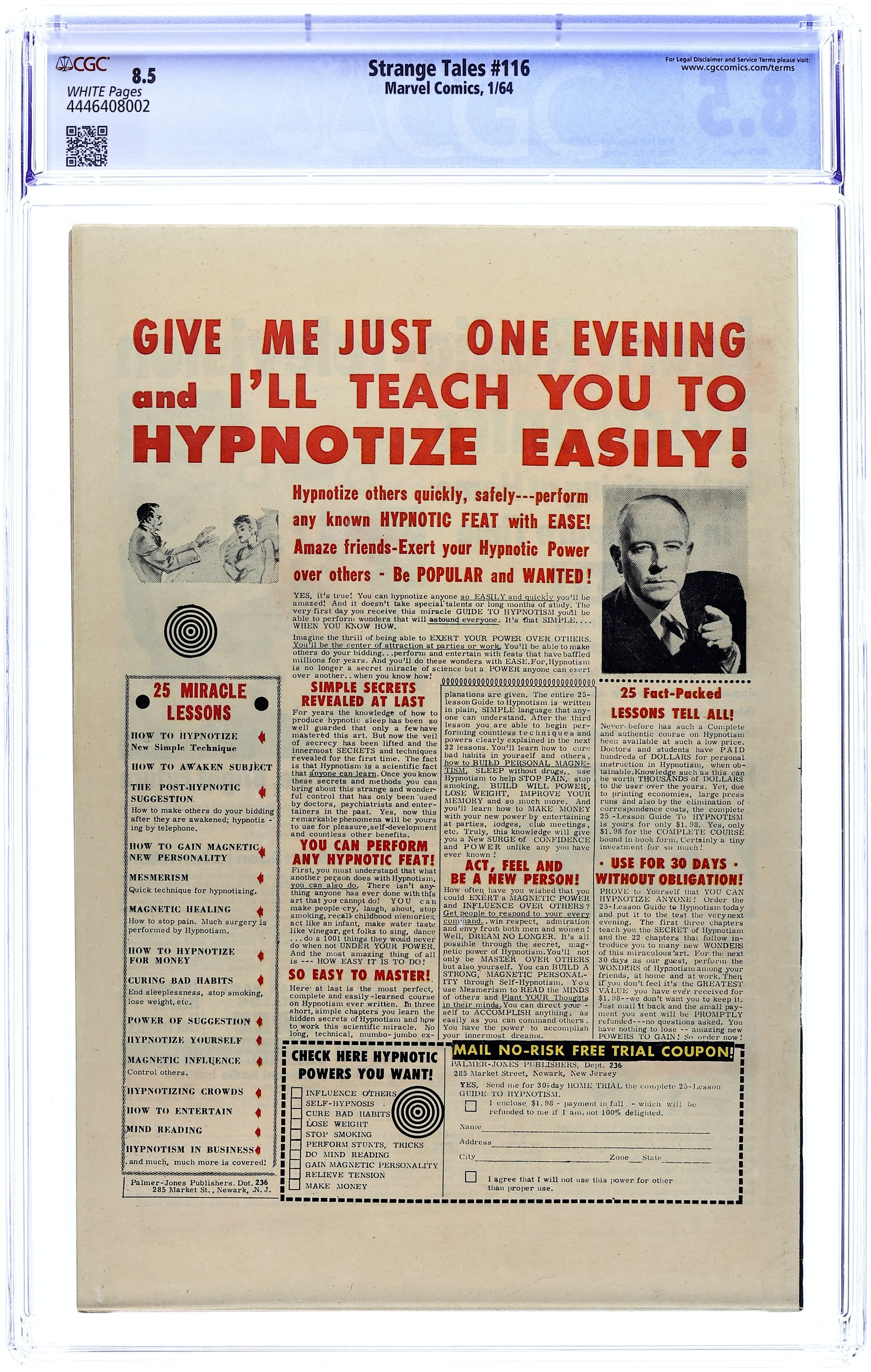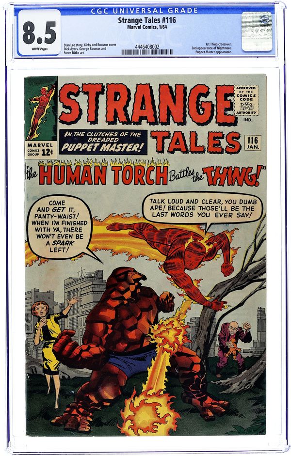 Cover pencils by Jack Kirby, inks by George Roussos. "In the Clutches of the Puppet Master!", script by Stan Lee, pencils by Dick Ayers, inks by George Roussos (as Geo. Bell); The Puppet Master manipulates the Thing into fighting the Human Torch, hoping to pick off the Fantastic Four one at a time; Sue Storm and Reed Richards cameos. "The Radio" text story. "Return to the Nightmare World!", script by Stan Lee and Steve Ditko (co-plot), art by Steve Ditko; Nightmare has discovered the ability to capture humans and bring them to his world for study while they sleep; The police ask Strange's help, as a "last resort," to discover the cause behind a rash of people unable to awaken; Strange tracks the cause down to the Nightmare World, and has a rematch with his old foe. 36 pgs., full color. Cover price $0.12.