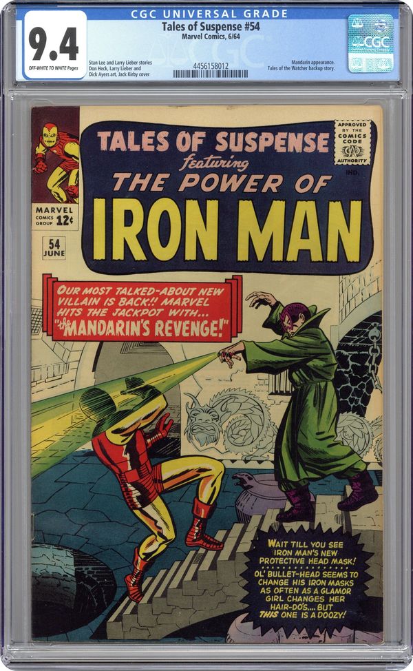 Cover pencils by Jack Kirby, inks by Chic Stone. Iron Man's costume gets a slight re-design in "The Mandarin's Revenge!", script by Stan Lee, art by Don Heck; Tony's observer missiles have failed in Vietnam; So, he goes to investigate, which leads him to the Mandarin; He attacks the Mandarin's castle, but he is captured. "Secret Mission" text story. "Skrang Strikes Tonight!", script by Stan Lee (plot) and Larry Lieber (script), pencils by Larry Lieber, inks by Dick Ayers; An invincible alien invader has weapons that can disable all Earth's armed forces, but he is frightened off when he sees an old lady's fox-fur collar. "Hands Off!", script by Stan Lee (plot) and Larry Lieber (script), pencils by Larry Lieber, inks by Chic Stone; The Watcher is tempted to break his vow of non-interference, but sees that it is for the best to obey. 36 pages, full color.