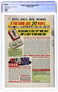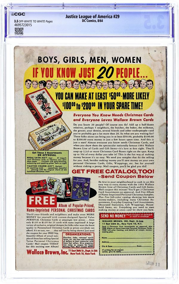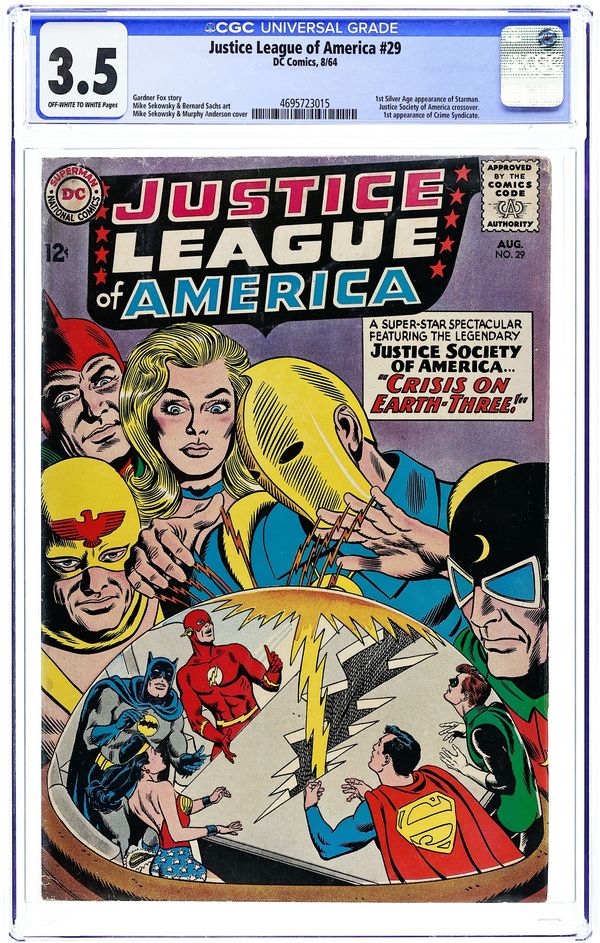 Cover pencils by Mike Sekowsky, inks by Murphy Anderson. Crisis on Earth-Three, script by Gardner Fox, pencils by Mike Sekowsky, inks by Bernard Sachs; The Crime Syndicate is so bored of life on their Earth as supreme villains, designated as Earth-3, that they come to the JLA's Earth for a new challenge after Ultraman accidentally discovers it when exposed to Green Kryptonite (which gives him a new power with every exposure to it); Just as it looks like the JLA has the upper hand, the Crime Syndicate teleports them to Earth-3, where they have the advantage; To secure a level battlefield the Crime Syndicate plans to go to the Earth-2 and eliminate the JSA. 1st Silver Age appearance of Star Man; Justice Society cross-over. Rocky and Bullwinkle star in a one-page Cheerios ad. 36 pgs. $0.12. Cover price $0.12.