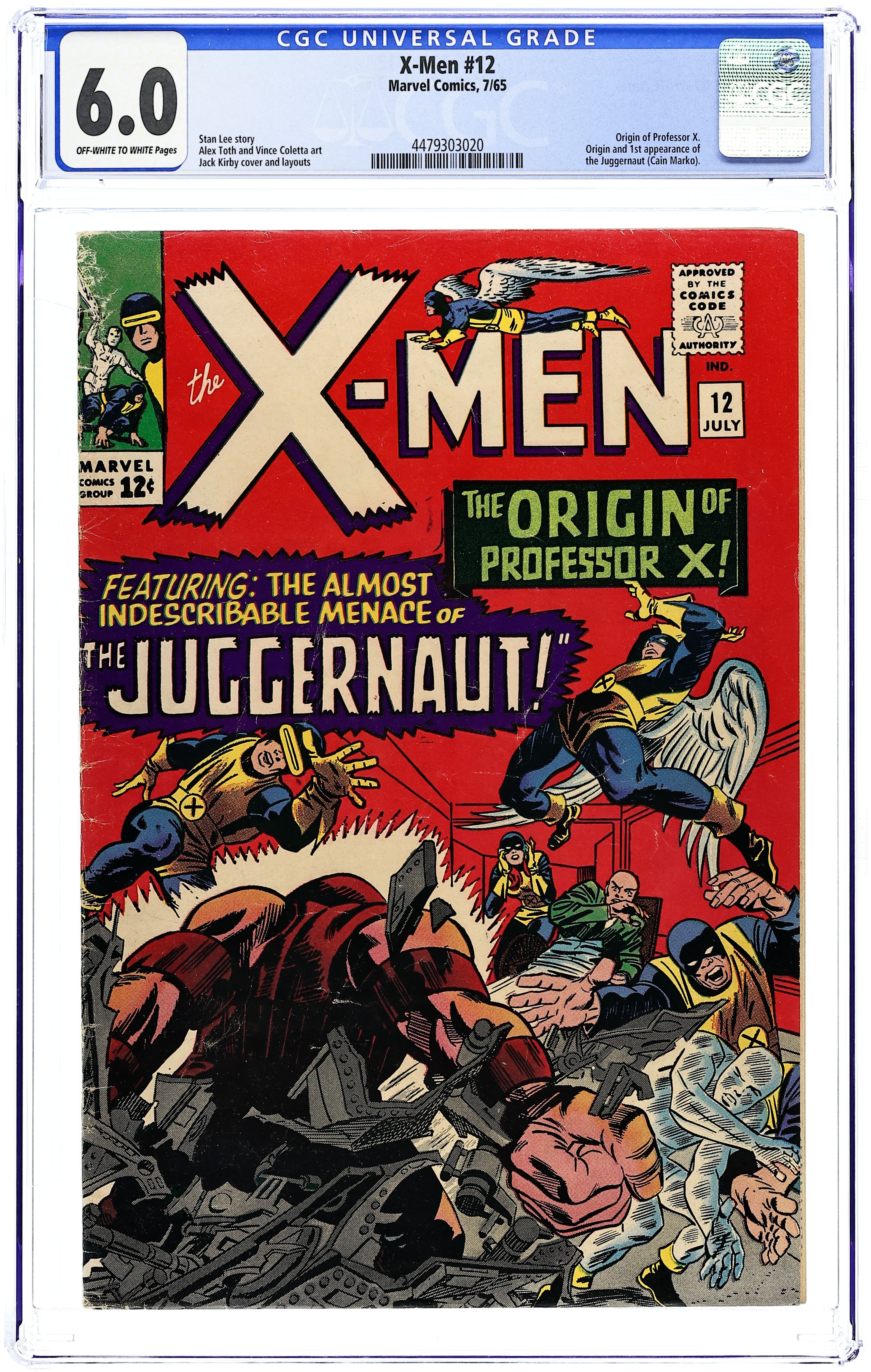 Cover pencils by Jack Kirby, inks by Frank Giacoia. The Origin of Professor X!, script by Stan Lee, pencils by Jack Kirby (layouts) and Alex Toth (pencils), inks by Vince Colletta; Cerebro detects a powerful mutant and Xavier fears that he knows who it is; The X-Men prepare the mansion for an all out assault; As the mysterious villain batters his way through the mansion's defenses, Professor X tells his students his origin story and how his step-brother changed from tormenting bully to an unstoppable Juggernaut; 1st appearance of the Juggernaut. 36 pgs. $0.12. Cover price $0.12.