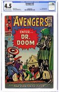 Cover pencils by Jack Kirby, inks by Dick Ayers. "Enter... Dr. Doom!", script by Stan Lee, pencils by Don Heck, inks by Dick Ayers; Scarlet Witch and Quicksilver recieve a letter from their Aunt in Latveria and decide to visit her; When they arrive they are jailed and discover it is a trap set up by Doctor Doom, who decides defeating the Avengers will instill fear in to the Fantastic Four,making them easy to defeat; The Fantastic Four attempt to assist the Avengers, but are not allowed, as interference could spark an international incident; Nevertheless, the Avengers escape and fight Doom to a standstill, where he causes a diversion and escapes. Avengers roll call: Captain America, Hawkeye, Quicksilver, and the Scarlet Witch. Guest appearance by the Fantastic Four. Letter to the editor from writer Steve Utley. Reprinted in Marvel Triple Action #19. 36 pgs., full color. $0.12. Cover price $0.12.