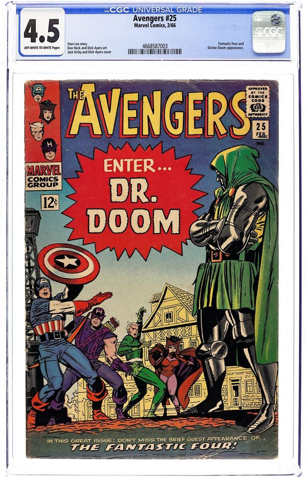 Starts Feb 9 Cover pencils by Jack Kirby, inks by Dick Ayers. "Enter... Dr. Doom!", script by Stan Lee, pencils by Don Heck, inks by Dick Ayers; Scarlet Witch and Quicksilver recieve a letter from their Aunt in Latveria and decide to visit her; When they arrive they are jailed and discover it is a trap set up by Doctor Doom, who decides defeating the Avengers will instill fear in to the Fantastic Four,making them easy to defeat; The Fantastic Four attempt to assist the Avengers, but are not allowed, as interference could spark an international incident; Nevertheless, the Avengers escape and fight Doom to a standstill, where he causes a diversion and escapes. Avengers roll call: Captain America, Hawkeye, Quicksilver, and the Scarlet Witch. Guest appearance by the Fantastic Four. Letter to the editor from writer Steve Utley. Reprinted in Marvel Triple Action #19. 36 pgs., full color. $0.12. Cover price $0.12.