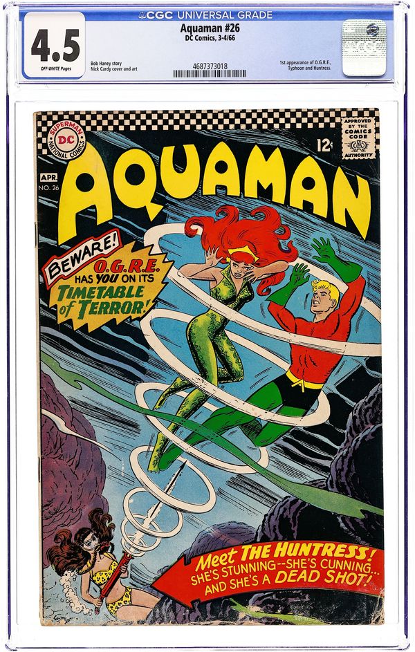 Cover art by Nick Cardy. From O.G.R.E. With Hate starring Aquaman, Aqualad, Mera, Aquababy, and O.G.R.E. [Supreme One; Typhoon; The Huntress], script by Bob Haney, art by Nick Cardy; while undertaking an undercover assignment for the government, Aquaman and Mera are attacked by the criminal organization, O.G.R.E. Fish Facts by Henry Boltinoff. Cap's Hobby Hints activity half-page by Henry Boltinoff. 36 pgs. $0.12. Cover price $0.12.