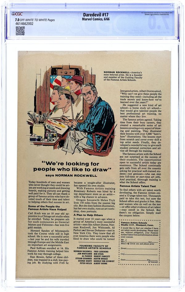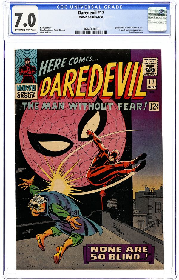 Cover pencils by John Romita, inks by Frank Giacoia. Spider-Man guest stars in None Are So Blind!, script by Stan Lee, pencils by John Romita Sr., inks by Frank Giacoia (as "Frank Ray"); Spidey, thinking he has discovered Daredevil's secret, accuses Foggy of being DD; Foggy kind of plays along to impress Karen; DD and Spidey stop fighting long enough to take down the Masked Marauder. 36 pgs. Cover price $0.12. Cover price $0.12.