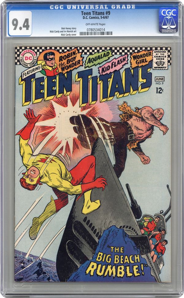 Written by Bob Haney. Art by Irv Novick and Nick Cardy. Cover by Nick Cardy. The Titans come to Baxter Beach to prevent violence at an annual rival college jamboree during spring break. After getting the two college gangs to work together, Captian Tiger shows up to raid the local town. Aqualad comments that they will miss the Batman TV show this week because of the mission, and a billboard outside Teen Titans headquarters advertises the Batman TV show. 36 Pages, Full Color. Cover price $0.12.