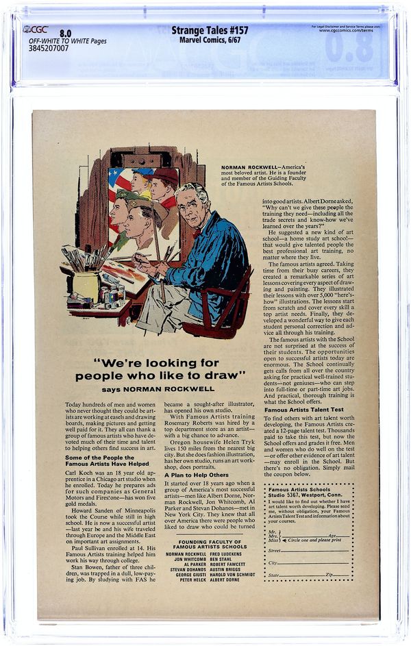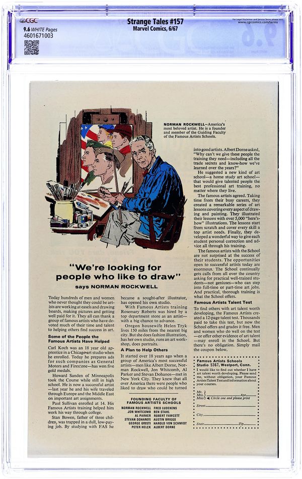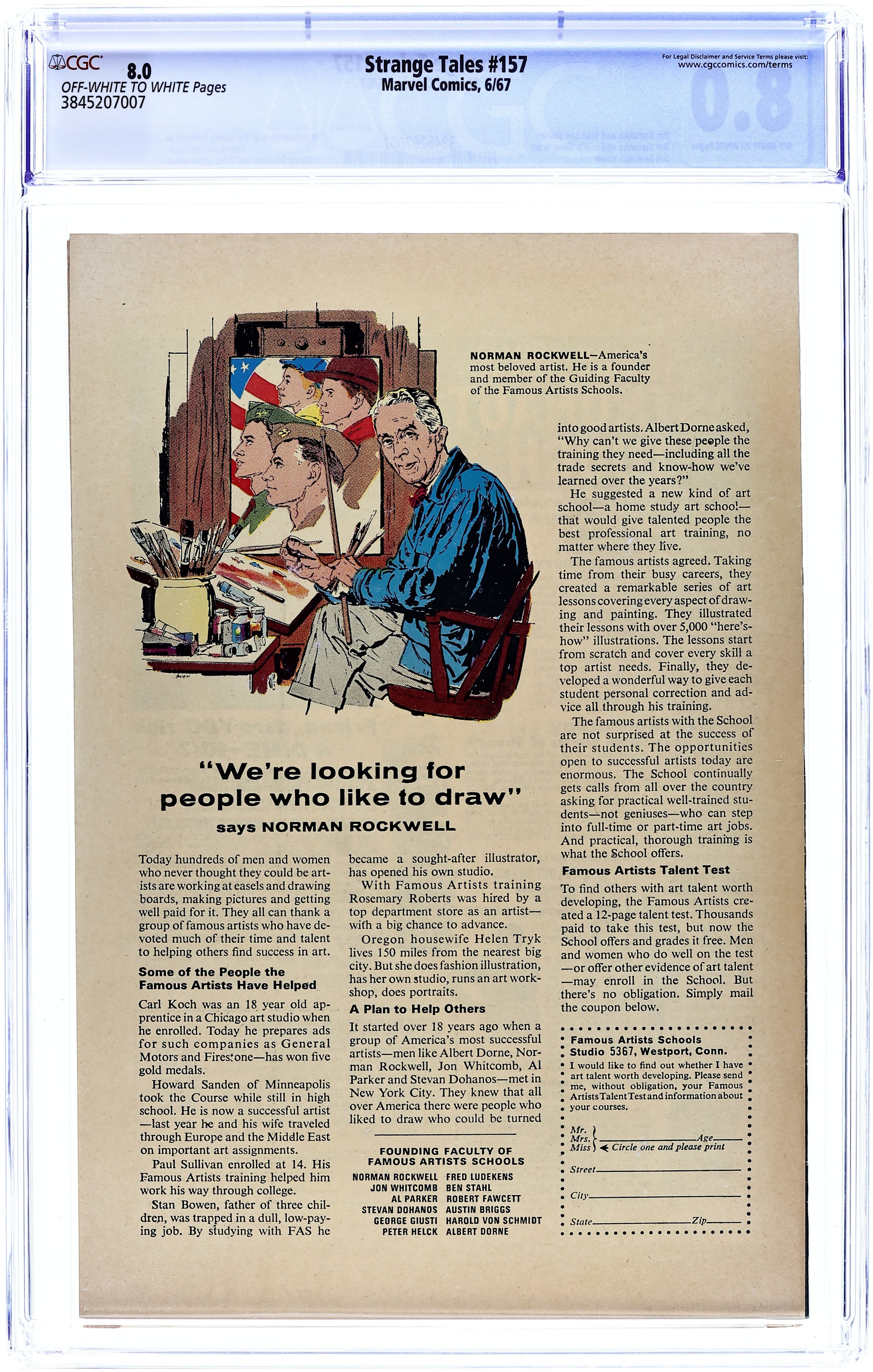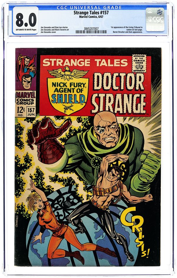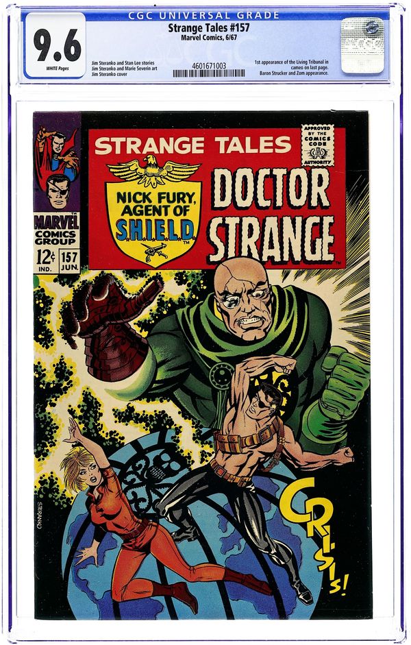 Cover art by Jim Steranko. Nick Fury stars in "Crisis!", script and art by Jim Steranko; Strucker announces that the impregnable dome over Hydra Island will keep them safe from the "Death Spore" plague, and plans to use Fury's body as the basis for an army of HYDRA androids to "police" the world, once he's dead from the Alpha Ray beam; But Fury escapes!; As SHIELD searches the Heli-Carrier for the bomb with no result, Fury, "playing it by ear", takes on one group of HYDRA thugs after another, until Strucker faces him one-on-one. "The End of the Ancient One!", script by Stan Lee and Marie Severin (co-plot), pencils by Marie Severin, inks by Herb Trimpe; In order to pass his powers onto his disciple, The Ancient One allows Zom to defeat him; Before Strange's eyes, his mentor is fused with one of the giant rocks at Stonehenge, but not before he utters a warning; A battle ensues; First appearance of the Living Tribunal. Merry Marvel Marching Society info and coupon. 36 pgs., full color. Cover price $0.12.