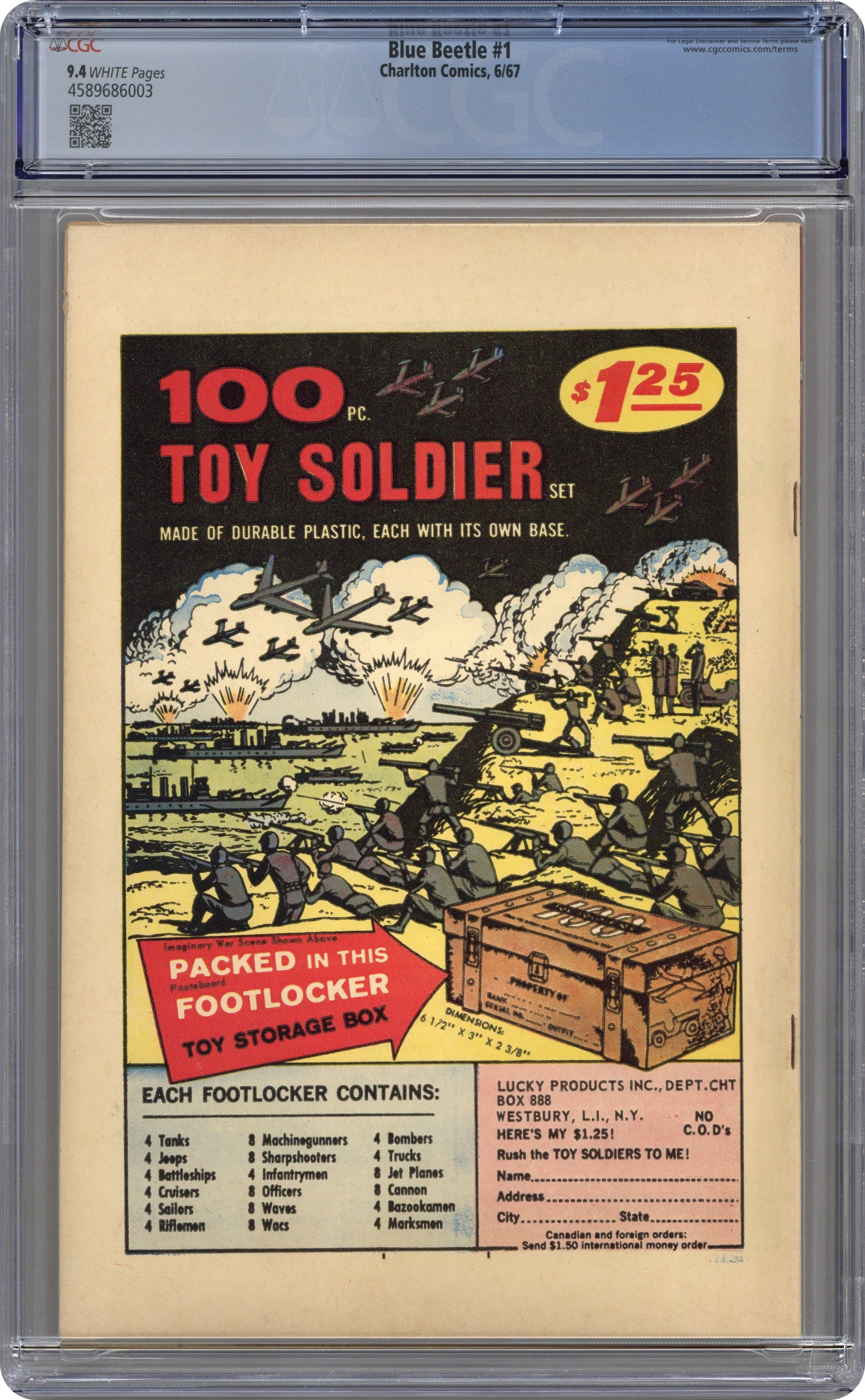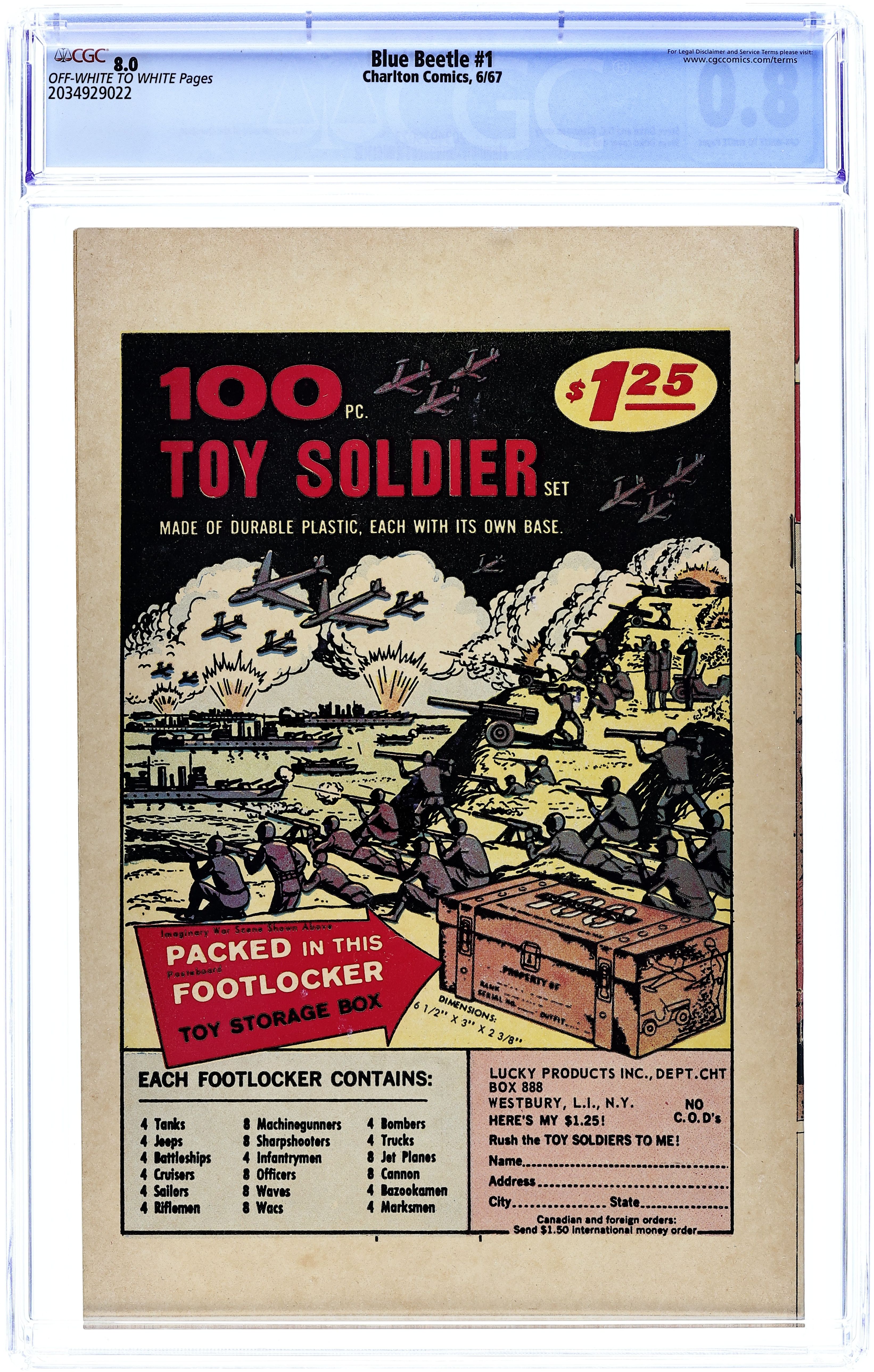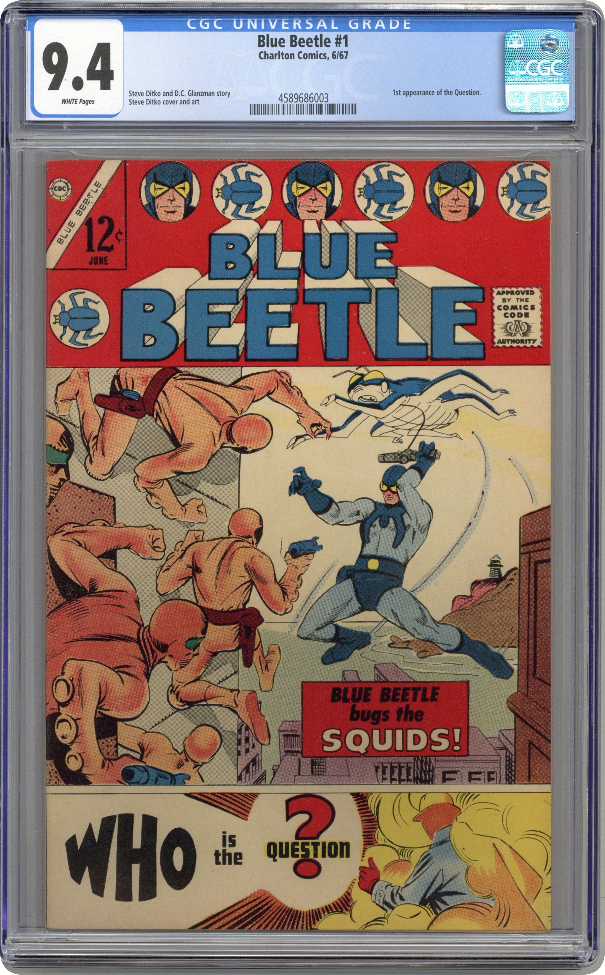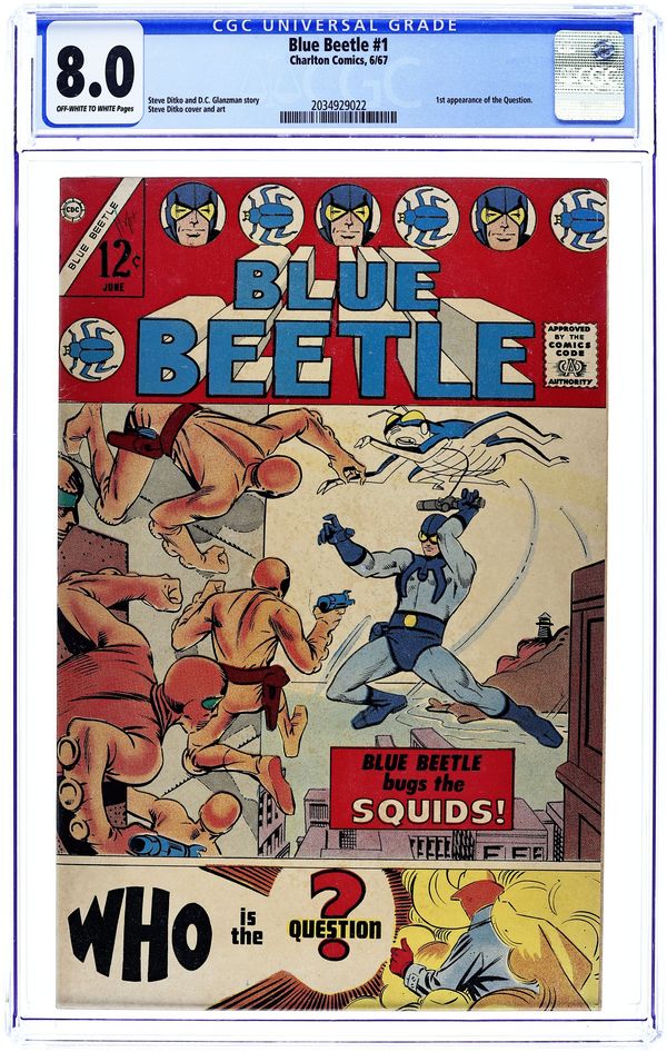 Cover by Steve Ditko. Stories and art by Steve Ditko, David Charles Glanzman and Dick Giordano. The third (or fourth, depending on how you count it) Charlton series to feature the Blue Beetle introduces the Silver Age BB, Ted Kord (after his debut as a backup character in Captain Atom). In one of the first superhero "reboots," Spider-Man co-creator Steve Ditko gives the Golden Age hero a new look, new tech, and a new alter ego, then sets him against the Squid Gang. The backup story introduces another classic Ditko hero: Vic Sage, the faceless crimefighter known as The Question. Blue Beetle Bugs the Squids; Who is the Question? 32 pages, Full Color. Cover price $0.12.