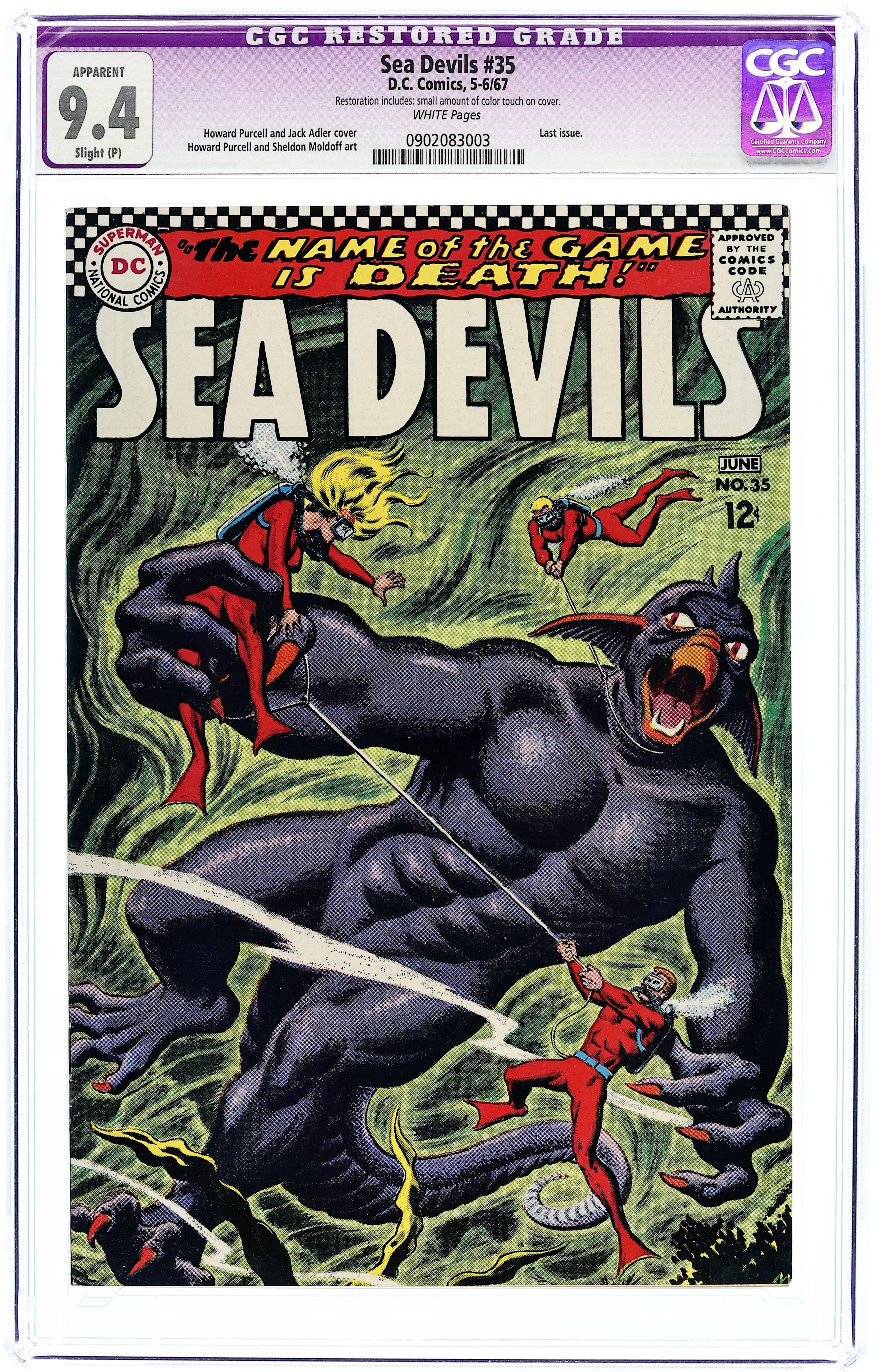 Final issue. The Name of the Game Is Death! - Written by unknown. Art by Howard Purcell and Sheldon Moldoff. Cover by Murphy Anderson and Jack Adler (color and wash effects). Don't miss the Sea Devils in a book-length adventure told in two chapters! Characters in this issue: Sea Devils [Dane Dorrance; Judy Walton; Nicky Walton; Biff Bailey]. Plus: untitled Cap's Hobby Hints half-pager by Henry Boltinoff. And: 1-page public service announcement "BEM Shows Up!" by Jack Schiff and Sheldon Moldoff. 32 pages, full color. Cover price $0.12.
