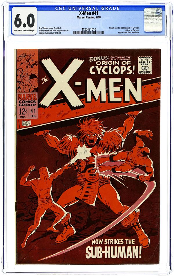 Starts Jan 3 First appearance of Grotesk. Cover pencils by Don Heck, inks by George Tuska. Now Strikes...the Sub-Human!, script by Roy Thomas, pencils by Don Heck, inks by George Tuska; the X-Men battle the Grotesk, the last survivor of the Sub-Humans. The Living Diamond!--The Origins of the Uncanny X-Men, script by Roy Thomas, pencils by Werner Roth, inks by John Verpoorten; Jack O'Diamonds wants Scott Summers to help him battle Professor Xavier; Jack O'Diamonds turns himself into a Living Diamond. 36 pgs. $0.12. Cover price $0.12.