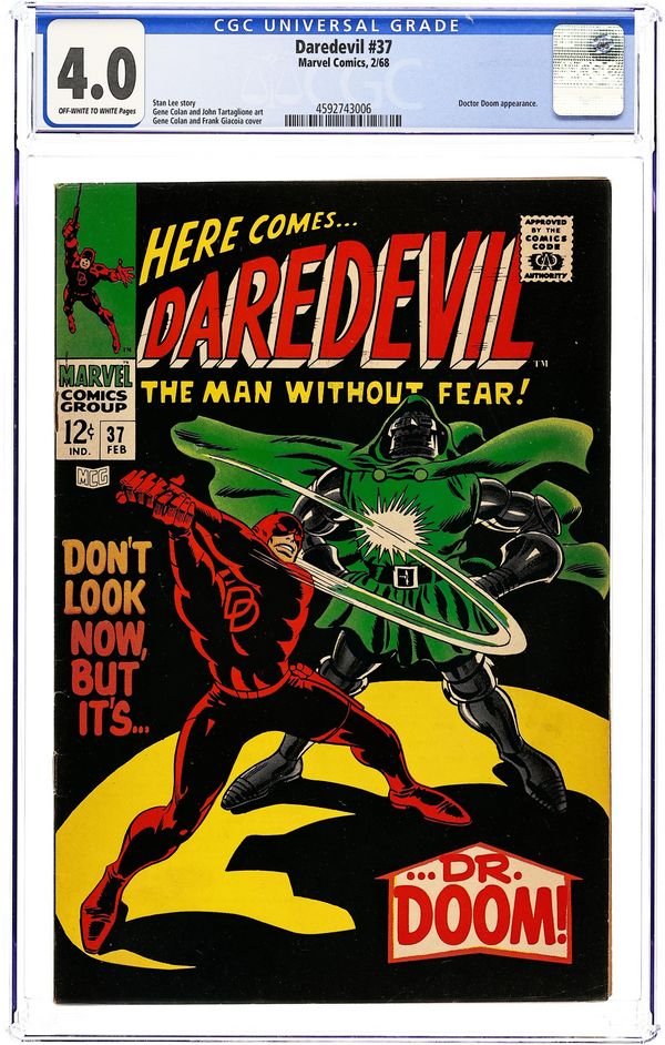 Cover pencils by Gene Colan, inks by Frank Giacoia. Don't Look Now, But It's Dr. Doom, script by Stan Lee, pencils by Gene Colan, inks by John Tartaglione; Doom captures Daredevil and switches bodies with our hero; cameo flashback featuring Mr. Fantastic, Invisible Girl, Human Torch, and Galactus. 36 pgs. Cover price $0.12. Cover price $0.12.