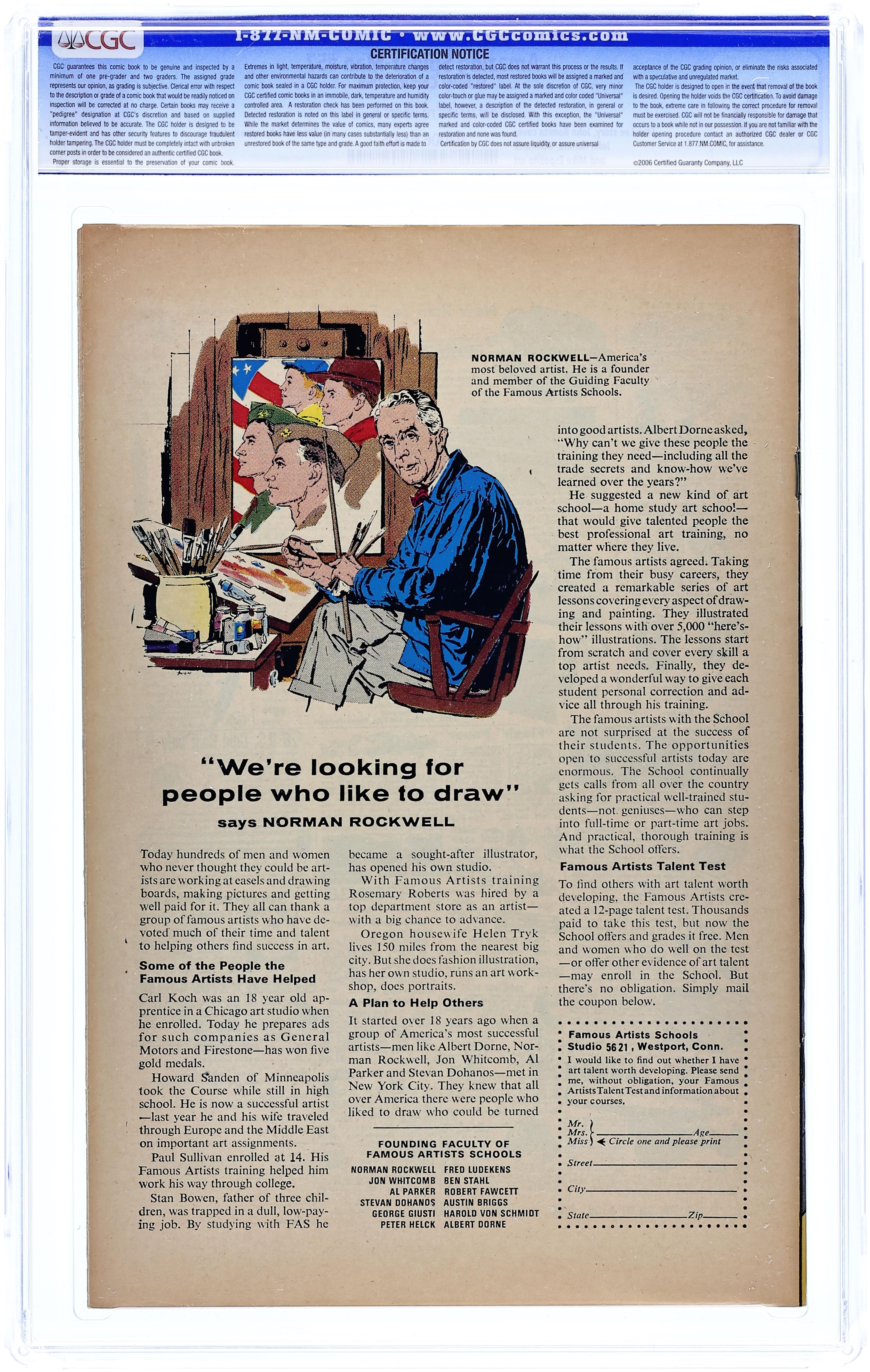 Cover pencils by Carmine Infantino, inks by Murphy Anderson. Death Stalks the Flash, script by John Broome, pencils by Ross Andru, inks by Mike Esposito; Iris gets sick and becomes delirious; she fears for the life of the Flash; Flash uses his powers to go to a dream dimension. Prof West--Lost Strayed or Stolen, script by John Broome, pencils by Ross Andru, inks by Mike Esposito; Professor Ira West goes to a memory workshop and encounters a crook who wants to find some buried loot. Open the Door, Earthman, script by Otto Binder, pencils by Carmine Infantino, inks by Bernard Sachs. Cap's Hobby Hints strip by Henry Boltinoff. Superman 204 ad. Letter from super fan Robert Jennings. 80 pg. Giant Sgt. Rock. Back cover Aurora model kit ad featuring Don Adams of Get Smart. 36 Pages, Full Color. Cover price $0.12.