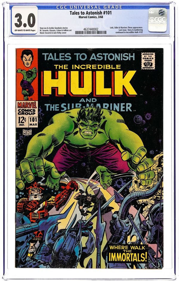 Cover by Marie Severin, Jack Kirby, Frank Giacoia, and Syd Shores. Where Walk the Immortals!, script by Stan Lee, art by Marie Severin and Frank Giacoia; Loki pulls the Hulk to Asgard to fight his father's forces; The Hulk battles the Warriors Three but in a moment of rare clarity, they discover that the jade giant is not really their enemy and refuse Loki's invitation to finish him off; Angered by his failure, Loki casts the Hulk into a bottomless pit. And Evil Shall Beckon, script by Archie Goodwin, art by Gene Colan and Dan Adkins; The Atlanteans abandon the second Atlantis; Namor goes to the Antarctic and finds Destiny hidden below the ice. 36 pgs., full color. The Hulk's solo adventures continue in the pages of Incredible Hulk (1962-1999 1st Series) #102. - Odinson, mycomicshop Archivist. Cover price $0.12.