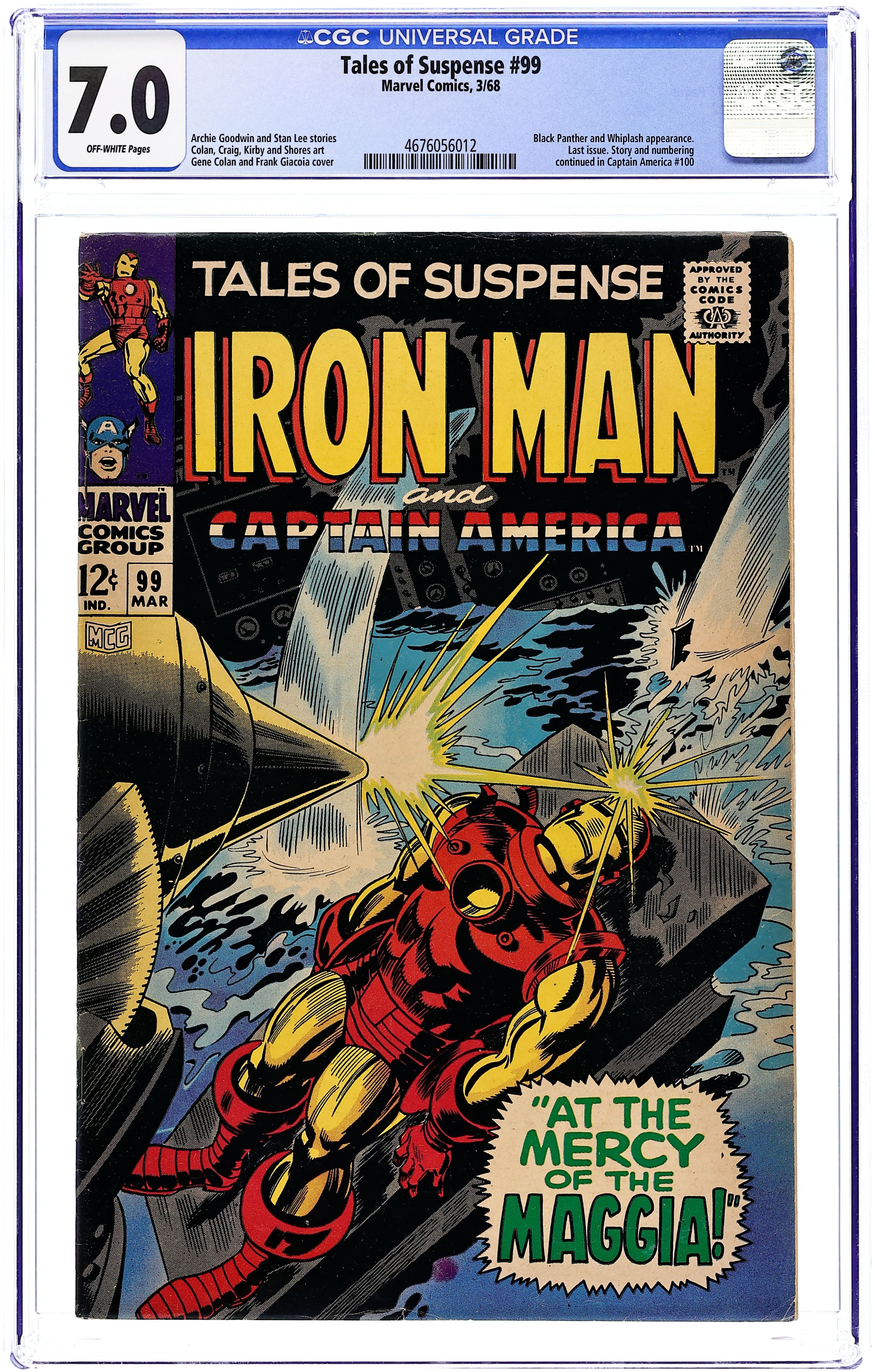 Final issue. Cover pencils by Gene Colan, inks by Frank Giacoia. "At the Mercy of the Maggia," script by Archie Goodwin, pencils by Gene Colan, inks by Johnny Craig; At the risk of putting greater strain on his heart Iron Man fires a repulsor ray at Whiplash; Jasper Sitwell searches for Iron Man after Tony Stark's cousin Morgan kidnapped him and took him to the Maggia; Nick Fury appearance; The story continues in Iron Man & Sub-Mariner #1. "The Man Who Lived Twice!", script by Stan Lee, pencils by Jack Kirby, inks by Syd Shores; Captain America and Black Panther continue their fight against Baron Zemo and his men; The story continues in Captain America #100. Letter to the editor from comic and book distributor Bud Plant. 36 pages, full color. Cover price $0.12.