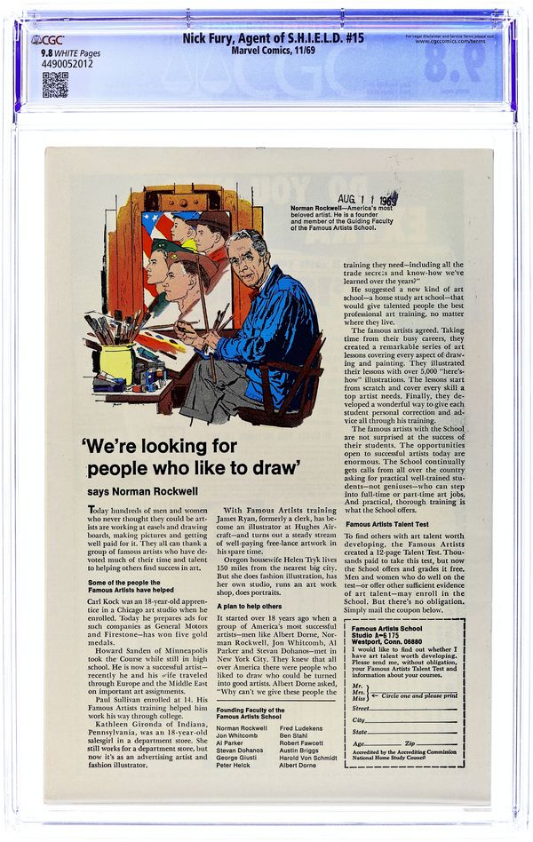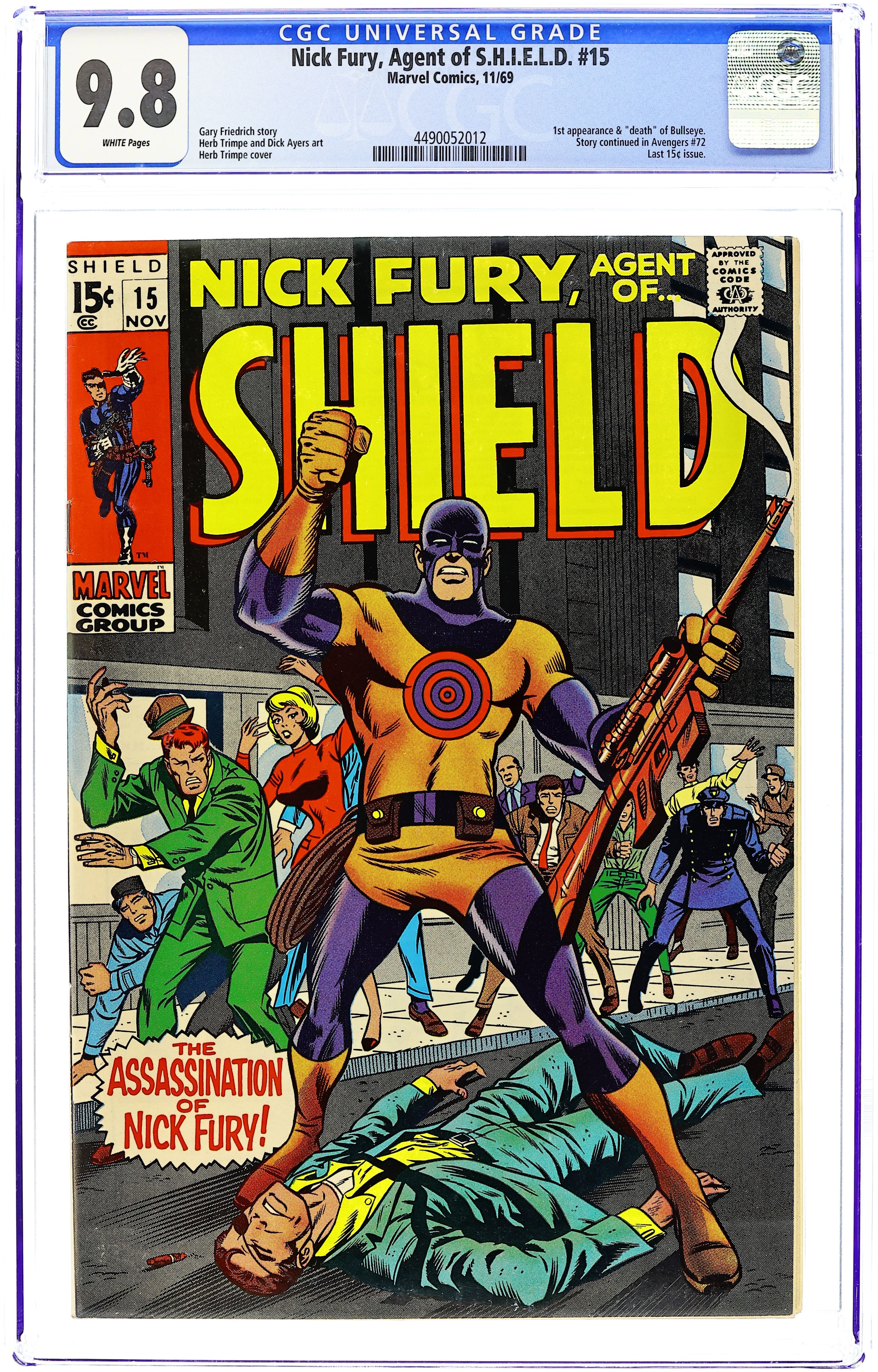 Cover pencils by Herb Trimpe, inks by Sam Grainger. First appearance and death of Bull's-Eye in "The Assassination of Nick Fury!", script by Gary Friedrich (plot, dialogue), Herb Trimpe (plot), and Dick Ayers (plot), pencils by Herb Trimpe and Dick Ayers, inks by Sam Grainger; HYDRA Number 72 hires the services of Bulls-eye, a paid assassin, to kill Nick Fury; Fury is concerned that 3 CIA operatives have been killed, and feels SHIELD could handle the investigation better than they could; Fury picks up Laura for a date, and as they drive, they're followed all over town by Bulls-eye; Number 72 plans to turn NYC into a "bloody battleground" within the hour following Fury's death; Fury & Laura attend a concert by Country Joe & The Fish in Central Park, when Bulls-eye strikes! Abruptly, Number 72 decides this would be the moment SHIELD would expect HYDRA to strike - and changes his plans!; Instead, SHIELD converges on Central Park, and corner Bulls-eye, who decides to shoot it out with them. Dugan shoots Bulls-eye dead, then ponders if there's any pieces of SHIELD left to pick up. 36 pgs., full color. $0.15. Cover price $0.15.