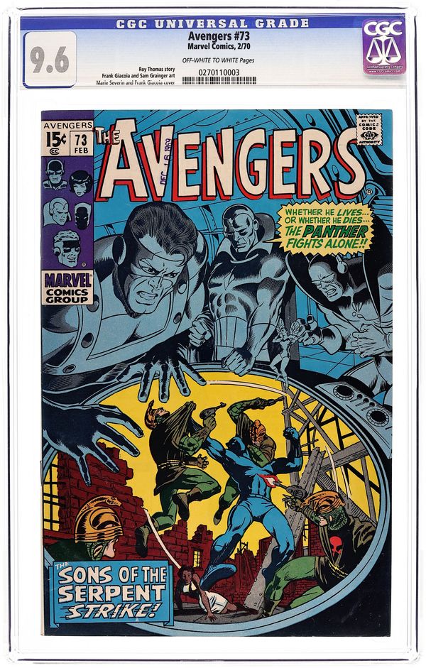 "The Sting of the Serpent" Part 1 of 2. Script by Roy Thomas. Pencils by Frank Giacoia. Inks by Sam Grainger. Cover by Marie Severin and Sam Grainger. The Sons of the Serpent prowl New York City once again! And the venomous hate group has a new target! An up-and-coming singer named Monica Lynne! But fortunately for the talented vocalist, she has a guardian angel or perhaps better yet…a guardian panther! The Black Panther successfully stops the serpents' abduction attempt of Monica! However, the next day when T'Challa hunts the serpents on his own, he falls prey to the radical supremacist group! The Sons of the Serpent have the panther! Will the Avengers be next? First appearance of Monica Lynne. Flashback cameos by Bill Foster and Captain America to recap the serpents' previous encounter with Earth's Mightiest Heroes in Avengers 32 & 33. Avengers Lineup: Black Panther, Goliath, Vision, Yellowjacket, and the Wasp. (Notes: This issue features a classic Marie Severin cover. Her most well-known Avengers cover and one of the very few she penciled for the Avengers series.) 36 pages. Cover price $0.15.