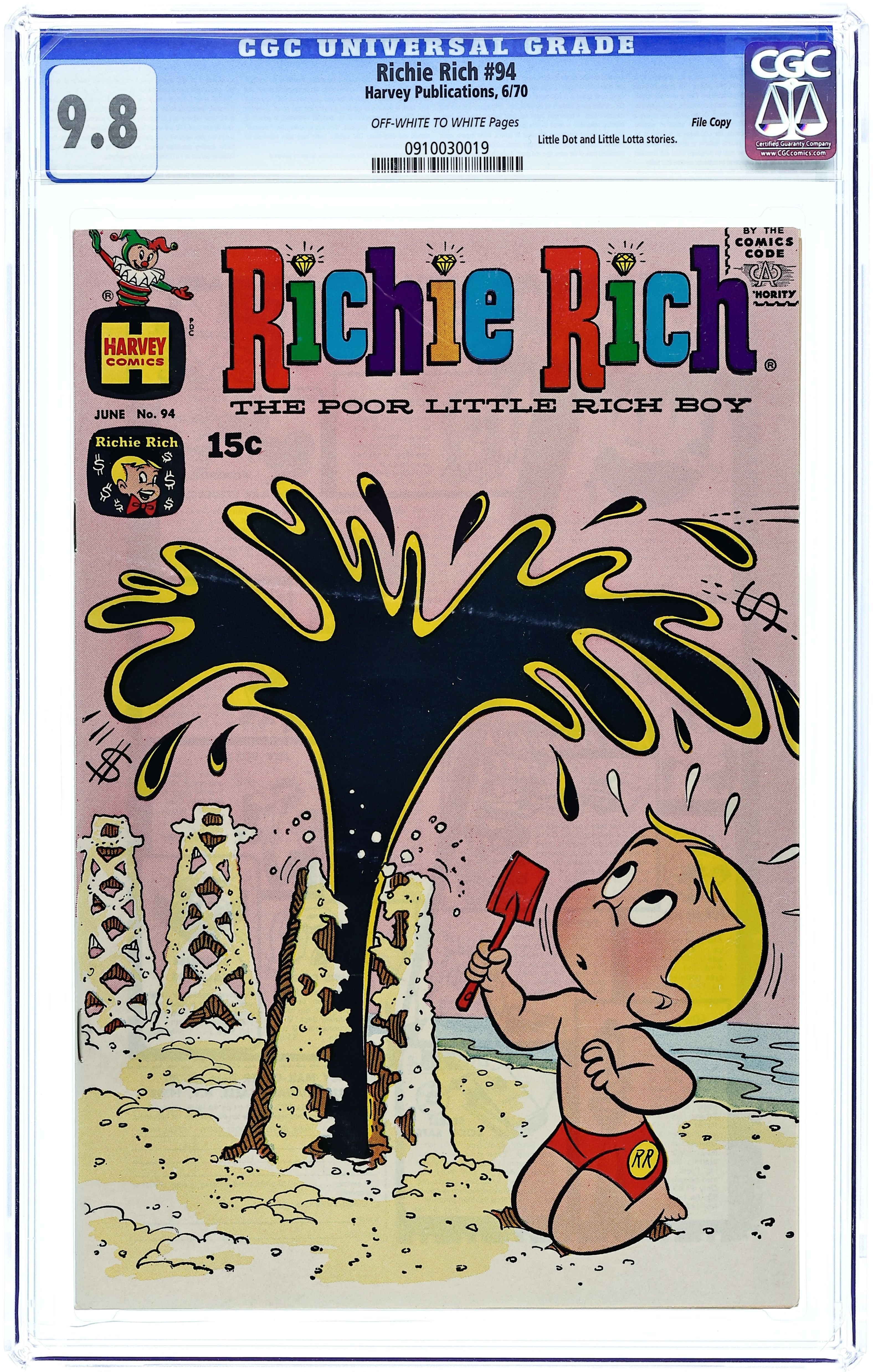 Harvey's flagship title featuring the adventures of Richie Rich, the richest kid in the world. A sudden bout of amnesia makes life memorable for the Rich family. Richie wonders what he should get his mean cousin Reggie for his birthday. The Big Forgetting; I Remember Richie; Little Dot: Dot Toy; Fat Chance; The Problem; Little Lotta: Lottas Fed Up! 32 pages, Full Color. Cover price $0.15.