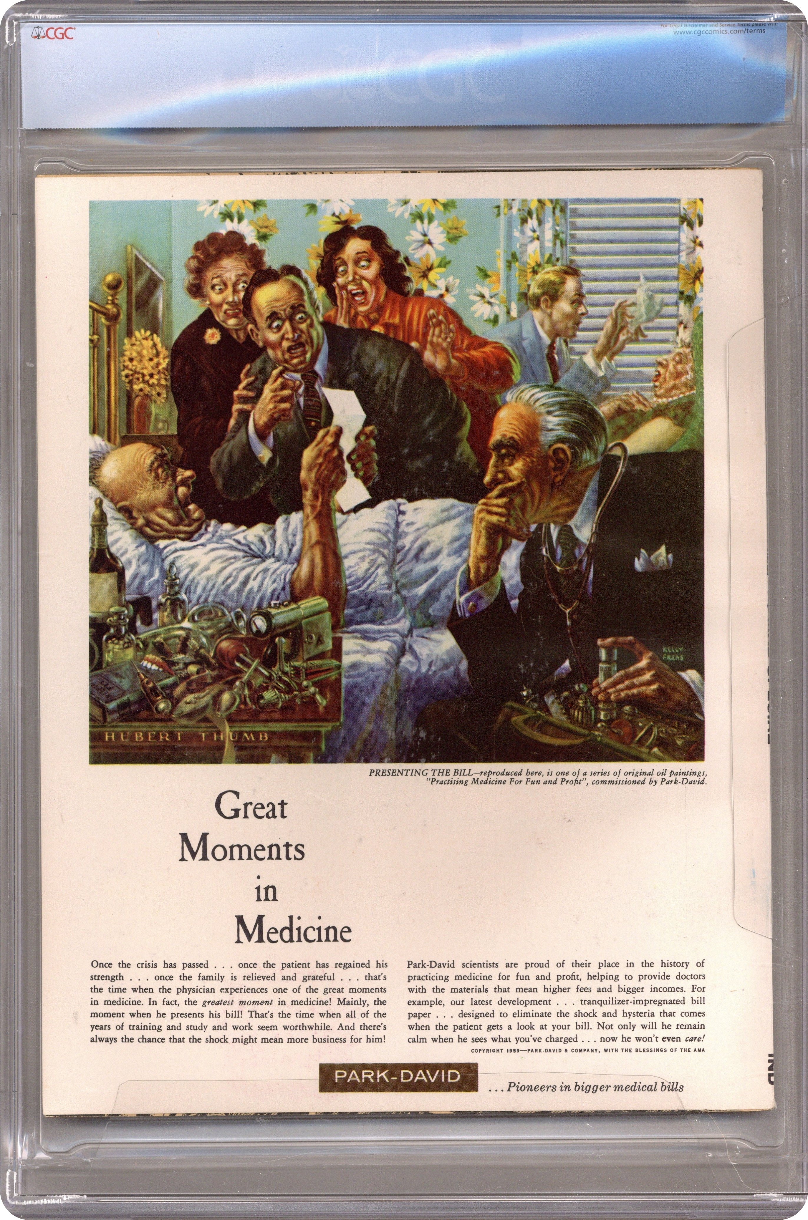 Includes Bonus Voodoo Doll. Cover by Norm Mingo, plus Mad logo by Don Martin. Stories and art by Don Martin, Al Jaffee, Larry Siegel, Angelo Torres, Max Brandel, Frank Jacobs, Arnie Kogen, Jack Rickard, Antonio Prohias, Paul Nonnast, Tom Koch, George Woodbridge, Lou Silverstone, Mort Drucker, Joe Orlando, Dave Berg, Wally Wood and Kelly Freas. The Mad Special, later known as the Super Special, reprinted movie spoofs and classic material from the magazine, often accompanied by original stories and attached bonuses in the form of posters, stickers, recordings and comics. Parodies of The Sound of Music, Mutiny on the Bounty and The Guns of Navarone, featuring art by Mort Drucker and Wally Wood. Spoofs of Budweiser beer ads and TV commercials by Al Jaffee. Classic Lighter Side strips by Dave Berg, and early Don Martin cartoons. Plus the Mad Voodoo Doll, an attached die-cut activity for the Mad reader. Paying for a Diamond Is Forever; The Sound of More Music; Hospital Signs We'd Like To See; If Kids Behaved Like Their Fathers; The Diplomat; The Mad Voodoo Doll; When Computer Match-Making Takes Over Completely; The Chiropractor; The Cavemen; The Nearsighted Man and the Telephone; In a "Greasy Spoon" Diner; The Brain Operation; The Defensers; TV Ads We'd Like to See - The Ill-State Insurance Commercial; The Tenth Hour; TV Ads We'd Like to See - The Polydent Commercial; Dr. Kiljoy; Eating Out; Rain; The Lighter Side of Dog Owners; The Lighter Side of Homeowners; Mutiny on the Bouncy; Scenes We'd Like to See - The Race Through the Jungle; For the Birds; The Guns of Minestrone; But Wiser Beer; Park-David Great Moments in Medicine. 8.5-in. x 11-in., 80 pages, B&W. Cover price $0.60.