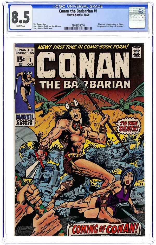 Cover pencils by Barry Windsor-Smith, inks by John Verpoorten. First comic book appearance and origin of Conan. The Coming of Conan!, script by Roy Thomas, pencils by Barry Windsor-Smith, inks by Dan Adkins; Conan battles at Vanaheim and sees his future; Tara returns to her dimension 1st comic book appearance of Kull (cameo). The letters page contains a map of Conan's world of the Hyborian Age drawn by Windsor-Smith (based on Robert E. Howard's own version) and a short essay on The World of Conan. 36 pgs. Cover price: $0.15. Cover price $0.15.