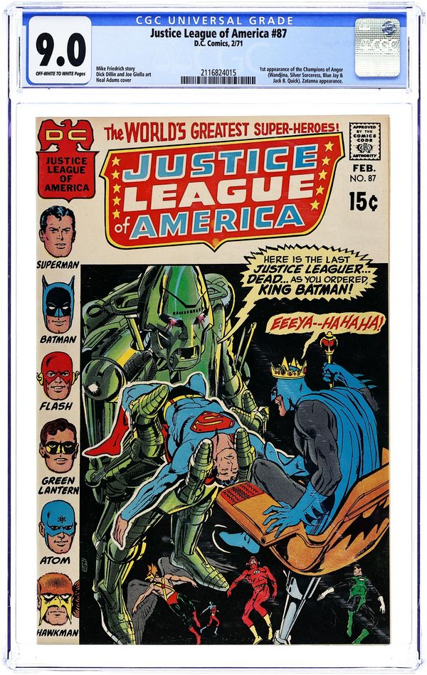 "Batman--King of the World." Script by Mike Friedrich, pencils by Dick Dillin, inks by Joe Giella. Letters to the editor from comics writer Martin Pasko and writer Alan Brennert. Neal Adams cover. 1st appearance of the Champions of Angor (Wandjina, Silver Sorceress, Jack B. Quick, and Blue Jay), a team of heroes that is a pastiche to the Avengers (Thor, Scarlet Witch, Quicksilver, and Yellowjacket). - Odinson, mycomicshop.com Archivist Cover price $0.15.
