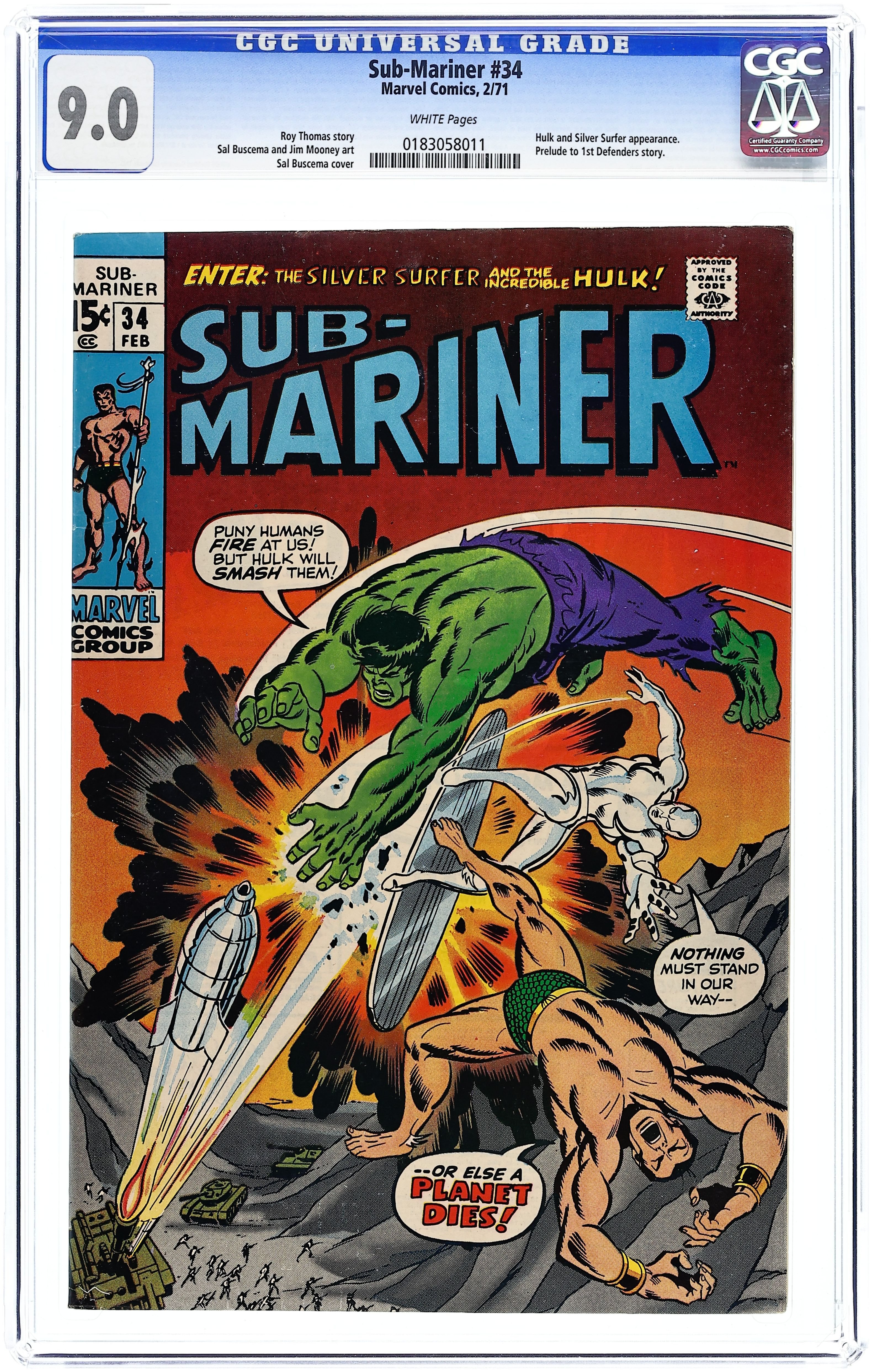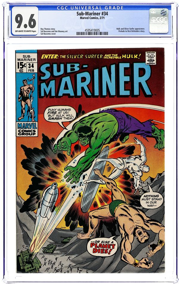 Cover by Sal Buscema. "Titans Three!" part one of two, script by Roy Thomas, pencils by Sal Buscema, inks by Jim Mooney; Sub-Mariner, Silver Surfer and the Hulk help the citizens of a small Central American country overthrow El General; Prelude (with #35) to 1st Defenders story. 36 pgs., full color. $0.15. Cover price $0.15.