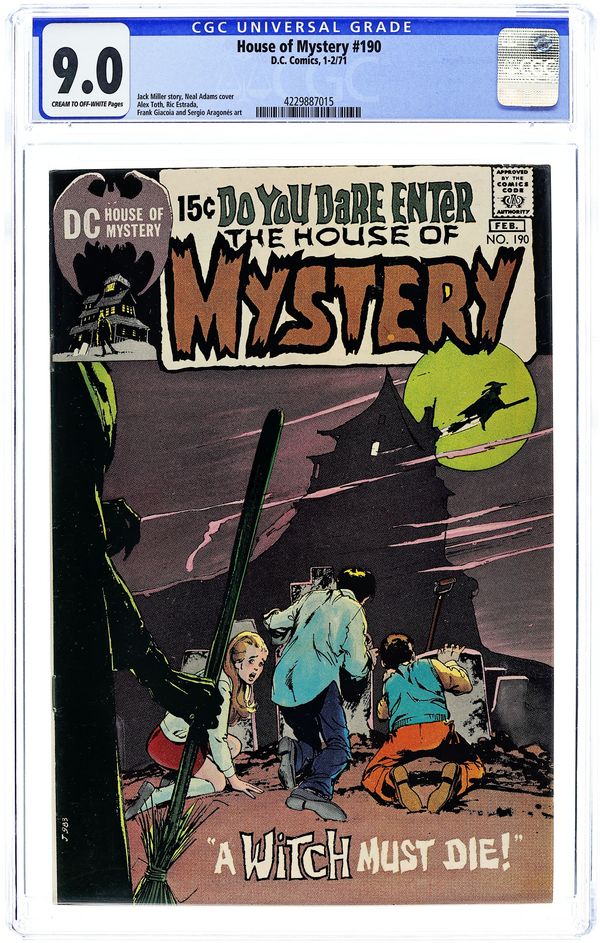 Cover by Neal Adams. Featuring: 1 page House of Mystery introduction "Welcome to the House of Mystery..." drawn by Sergio Aragones; 10 page story "Fright" drawn by Alex Toth; 1 page Room 13 activity "Cut the dotted lines and put your fingers through the holes..." drawn by Sergio Aragones; 1 page Cain's Game Room filler "Cain's Game Room" drawn by John Albano; 1 page Cain's Gargoyles filler drawn by Sergio Aragones; 9 page story "A Witch Must Die!" written by Jack Miller and drawn by Ric Estrada & Frank Giacoia. 36 Pages, Full Color. Cover price $0.15.