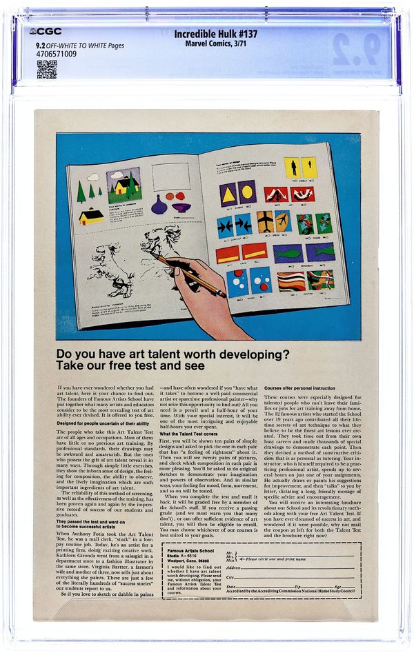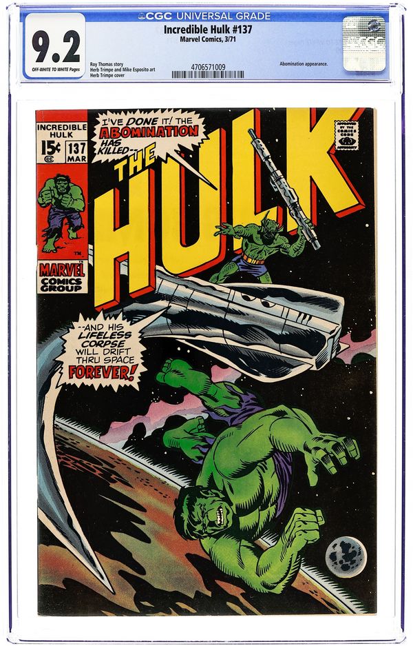 Cover art by Herb Trimpe. The Stars Mine Enemy!, script by Gerry Conway and Roy Thomas, pencils by Herb Trimpe, inks by Mike Esposito; Hulk finds himself aboard a spaceship where he is pressed into service; Hulk settles into this new life with alien comrades, even though the first mate of the ship is the Abomination, one of his most hated enemies; After the Abomination tries to kill him, Hulk is brought before the ship's half-human and half-robot captain, Cybor, who explains the cause of his quest to track down and kill the monstrous Klaatu; As the ship's crew has a final confrontation with Klaatu, Abomination starts a fight with the Hulk and both of them battle as they fall back into Earth's atmosphere. 36 pgs. $0.15. Cover price $0.15.