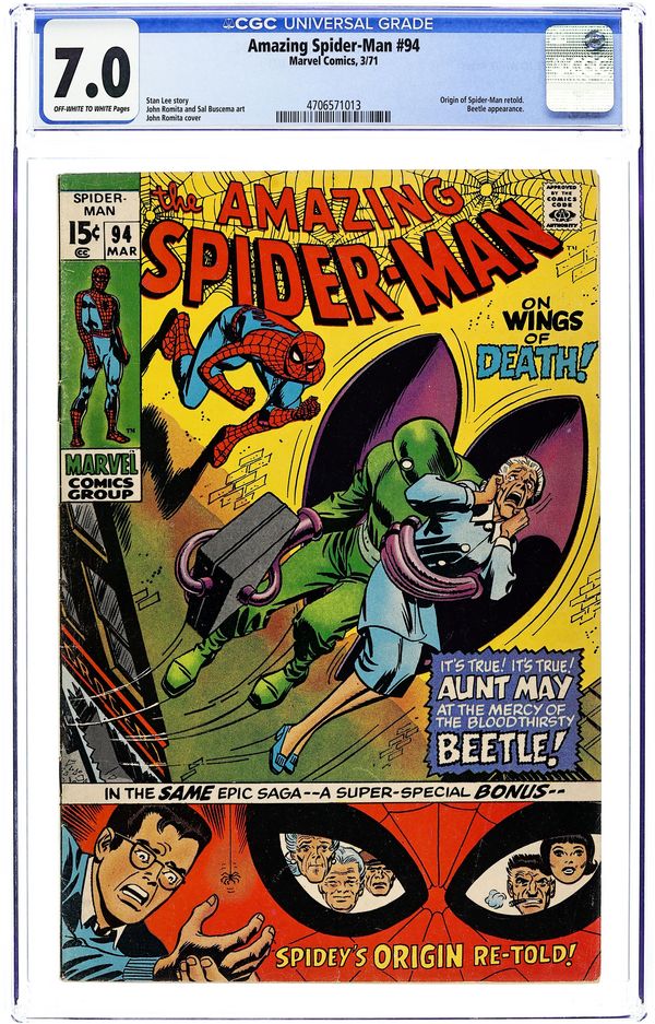 "On Wings of Death!" Script by Stan Lee. Pencils by John Romita. Inks by Sal Buscema. Cover by John Romita. These are sad days for Peter Parker as his girlfriend, Gwen Stacy, has moved to London. So to get his mind off his troubles, Peter walks to Queens to visit his Aunt May. And thank goodness he does! Because May Parker has been taken hostage by the Beetle while grocery shopping! The web-slinger is horrified that his aunt is in danger! And he makes a beeline to the grocery store -- for a very personal fight against the belligerent Beetle! Retelling of Spider-Man's origin. Cameo appearances by Betty Brant and Anna Watson. (Notes: This issue features a full-page panel of Spider-Man encircled by eight of his greatest foes. This story was reprinted in Marvel Tales #75.) 36 pages. Cover price $0.15.
