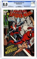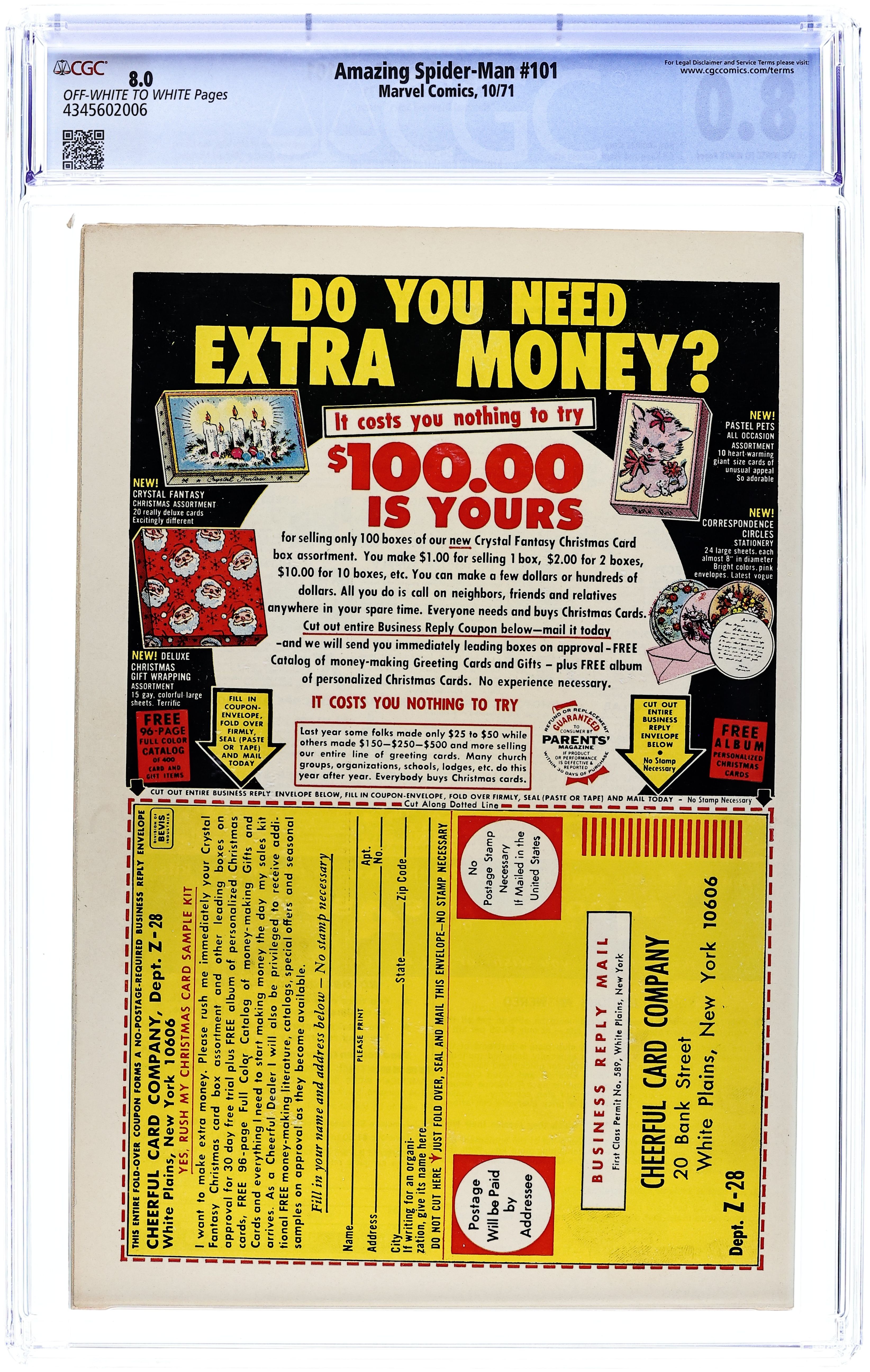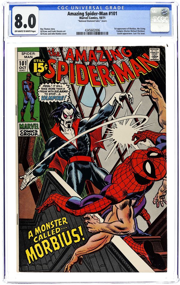 First appearance of Morbius the Living Vampire in "A Monster Called Morbius!" Script by Roy Thomas. Pencils by Gil Kane. Inks by Frank Giacoia. Cover by Gil Kane and John Romita. The first 100 issues of the Amazing Spider-Man title are in the books! And the next chapter in the web-slinger's anthology kicks off with the debut of Marvel's first bronze age vampire: Morbius! However, at the moment Peter Parker has a much bigger problem on his (six) hands. After drinking the special potion he developed, Aunt May's nephew grew four additional arms! Oh, my goodness! Peter is desperate to find a way to remove the arms, so he calls Dr. Curt Connors for help. Dr. Connors has a summer house and laboratory in Southampton on Long Island...and he gives Spider-Man permission to stay there and work on a cure. Meanwhile, a strange, pale, and bloodthirsty man is the sole survivor of a shipwreck near Southampton. And he's looking for a quiet place to rest. Oh no. Is the six-armed Spider-Man on a collision course with a living vampire? Oh yes! Cameo appearances by Gwen Stacy, J. Jonah Jameson, Joe Robertson, and the Lizard. Last 15¢ cover price. (Notes: This is the first issue of the Amazing Spider-Man series not written by Stan Lee. There exists a second printing of this issue published in 1992 with a silver background cover. Marvel also published a facsimile edition of Amazing Spider-Man 101 in 2021.) 36 pages. Cover price $0.15.