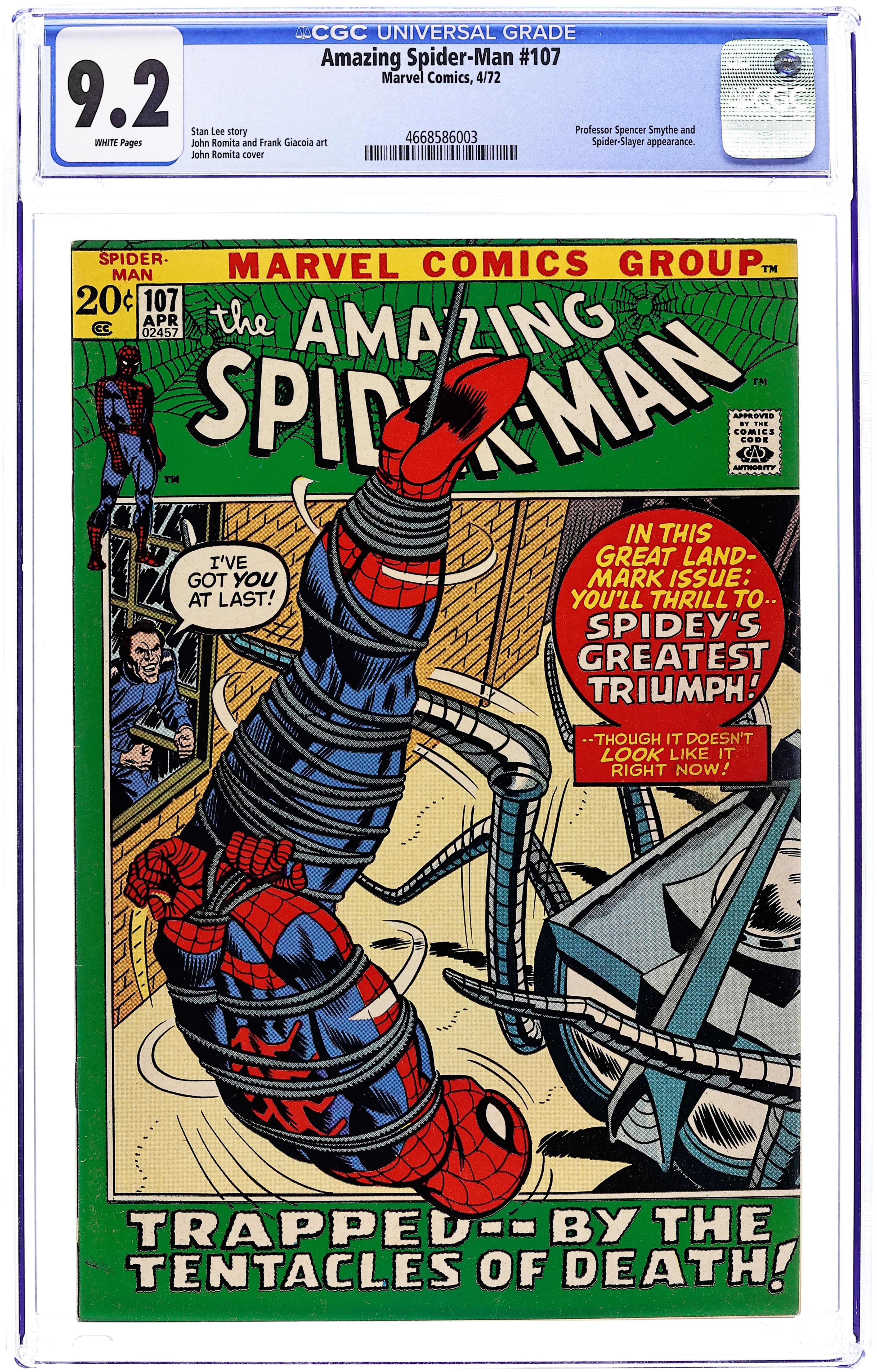 "Spidey Smashes Through!" Part 3 of 3. Script by Stan Lee. Pencils by John Romita. Inks by Frank Giacoia and Tony Mortellaro (backgrounds). Cover by John Romita and Frank Giacoia. It's the final confrontation between the Amazing Spider-Man and the spider slayer! Professor Smythe thinks he has all the bases covered, but the web-slinger has a plan -- to knock out both the spider slayer and its creator! And if Spider-Man emerges victorious, he'll have a few choice words for J. Jonah Jameson afterwards! What an awesome fight! In the meantime, Flash Thompson is in a troubled state of mind after returning from Vietnam. So hereaches out to Gwen Stacy for help. Cameo appearances by Harry Osborn and Randy Robertson. (Notes: Professor Smythe returns with his next spider slayer in Amazing Spider-Man 150. This story was reprinted in Marvel Tales #86.) 36 pages. Cover price $0.20.