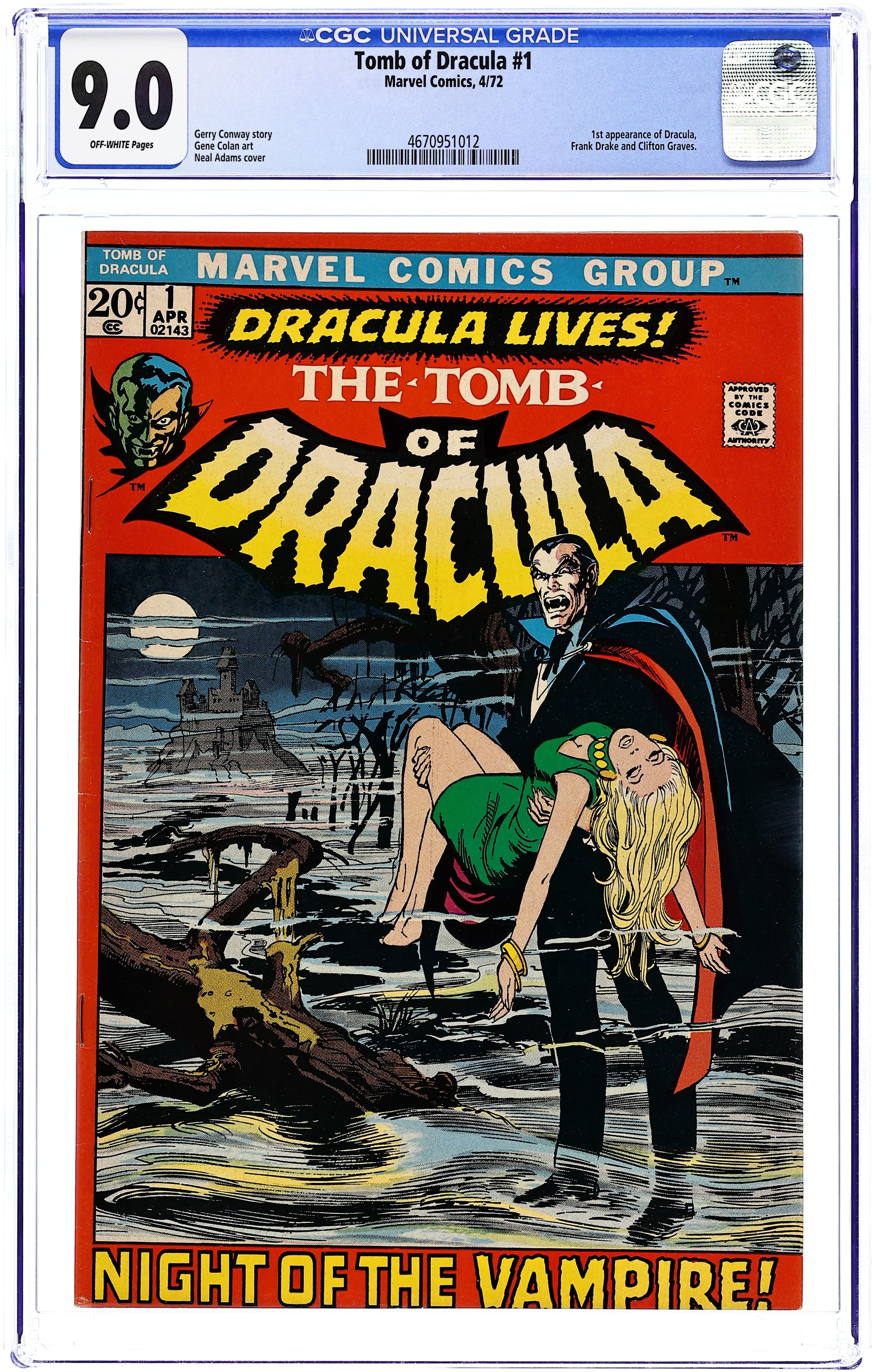 1st appearance of Dracula in a Marvel comic in "Dracula" Written by Gerry Conway. Art by Gene Colan. Cover by Neal Adams. When Frank Drake finds himself drawn to a mysterious castle in the mountains of Transylvania, he accidentally reawakens an ancient curse and unleashes a powerful force for evil onto the world. Dracula, Lord of the Vampires, stalks the earth once more! 32 pages, FC. NOTE: 1st appearance of Frank Drake. Cover price $0.20.