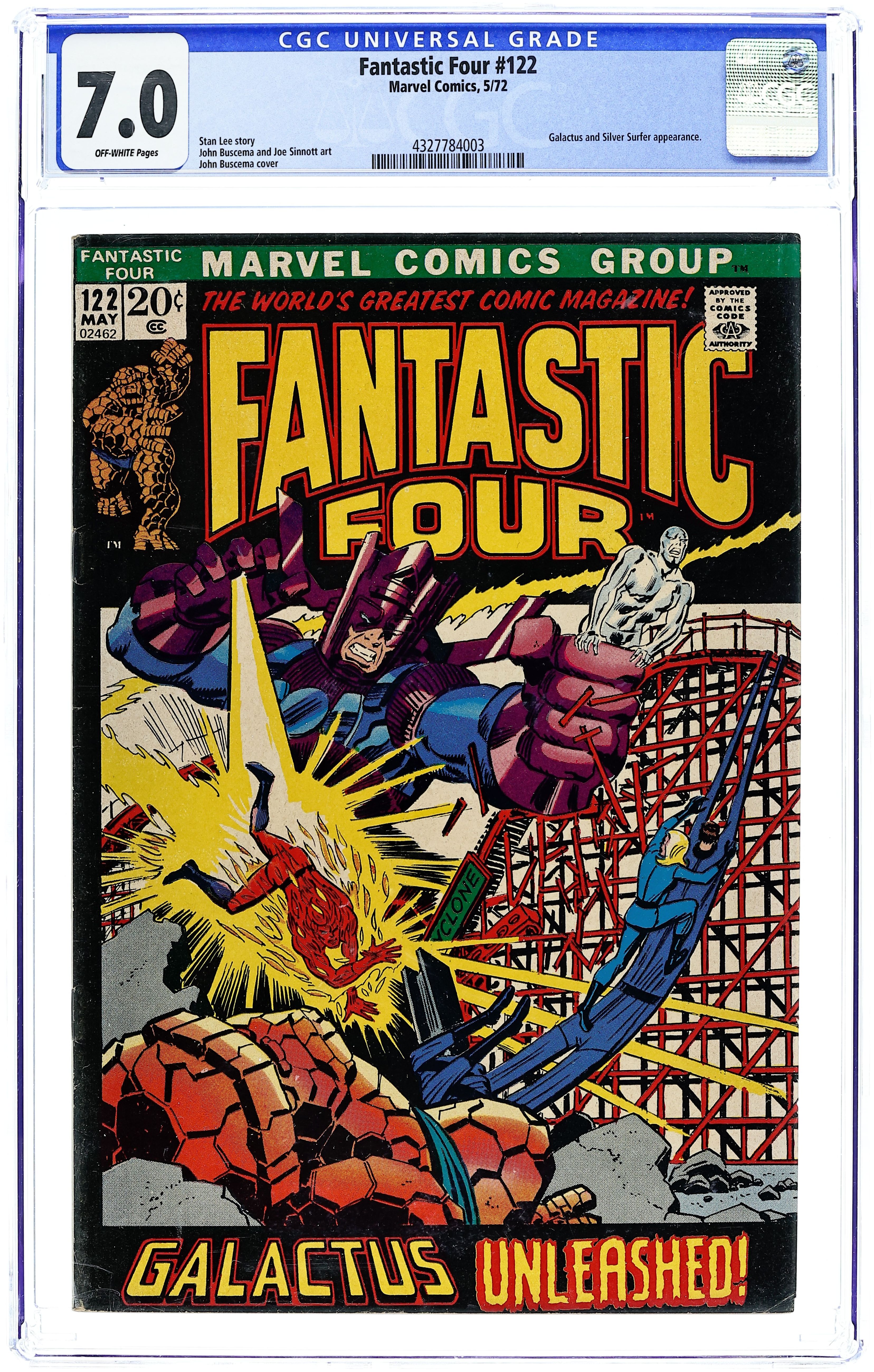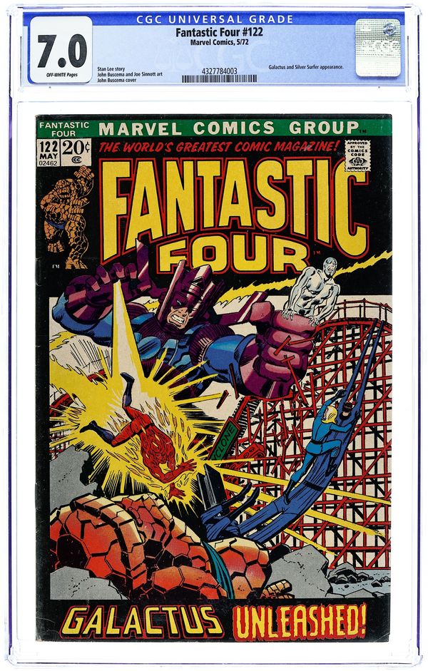 The Silver Surfer and Galactus guest star in "Galactus Unleashed , " Part 3 of 4 . Script by Stan Lee. Pencils by John Buscema and inks by Joe Sinnott with touch-ups by John Verpoorten and John Romita Sr.). Cover by John Buscema and John Romita. Wow! Galactus has come back to Earth! Is this the beginning of the end for the third planet from the sun?!? Maybe not. The Ravager of Worlds is willing to make a deal...he'll spare the Earth if the surfer will become his herald again. After the sky-rider declines, the furious free-for-all begins! The Thing, Human Torch, and Silver Surfer vs. Galactus! Awesome! Meanwhile during the battle, Mr. Fantastic and the Invisible Girl blast off into space to skyjack Galactus' massive starship! (Notes: Galactus previously appeared in Thor 168 and 169. The letters page includes a letter from comics writer Scott Edelman. The letters page also contains a statement of ownership: average print run 460,000; average paid circulation 275,930.) 36 pages Cover price $0.20.