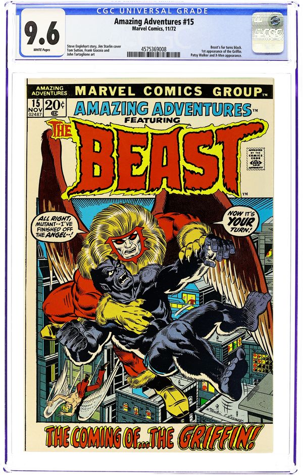 Cover pencils by Jim Starlin, inks by Joe Sinnott. "Murder In Mid-Air!", script by Steve Englehart, pencils by Tom Sutton, inks by Frank Giacoia and John Tartaglione (as John Tartag); Injured during his battle against Quasimodo, the Beast stumbles to the apartment shared with Patsy Walker and her husband Buzz; Only Patsy is home, and she takes the wounded Beast to her couch and administers first aid; In a delirious state the Beast reveals that he is really Hank McCoy and explains the series of events that led to him being turned into the Beast; While explaining that he was injured fighting Quasimodo, Beast considers the idea that he is continuing to mutate; Beast fights Griffin. 36 pgs, full color. $0.20. Cover price $0.20.