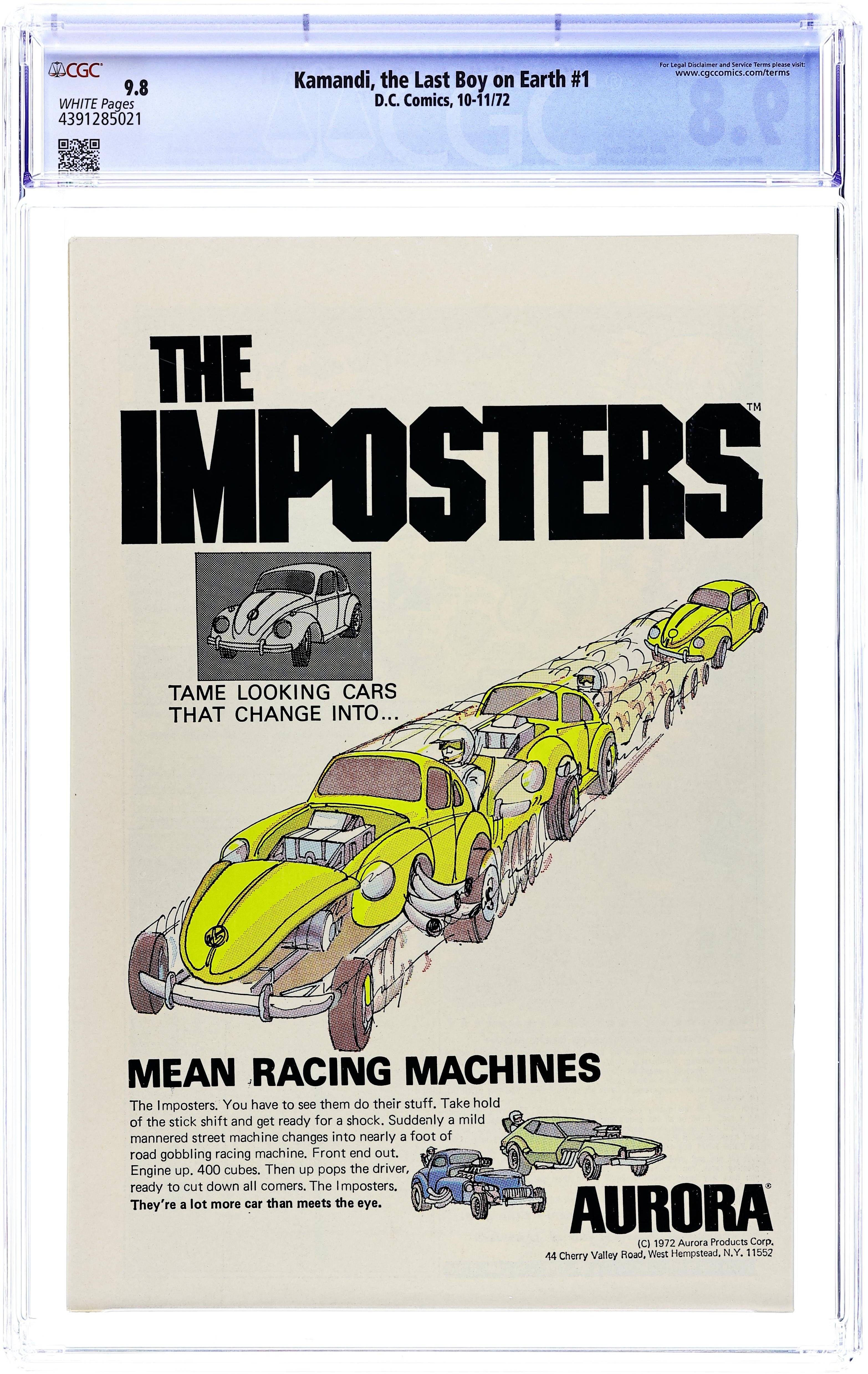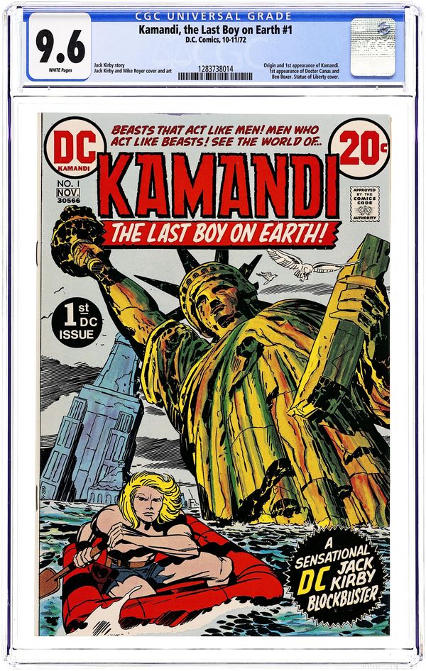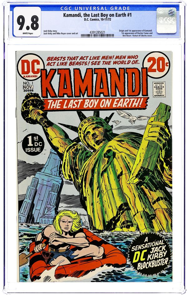 1st appearance and origin of Kamandi. "The Last Boy on Earth." Script and pencils by Jack Kirby, inks by Mike Royer. Cover by Kirby and Royer. A series that borrows many concepts from Planet of the Apes, Kamandi takes place in an alternate future where animals have mutated into bipedal beings of intelligence and where humans are treated like savage beasts. Kamandi avenges the death of his grandfather, who was killed by wolves, but is then captured by a tiger named Caesar, who turns him over to dog-scientist Dr. Canus. Canus proceeds to help Kamandi, and this is where the so-called last boy on earth hooks up with Ben Boxer, a mutated human who can turn to living metal. Cover price $0.20.