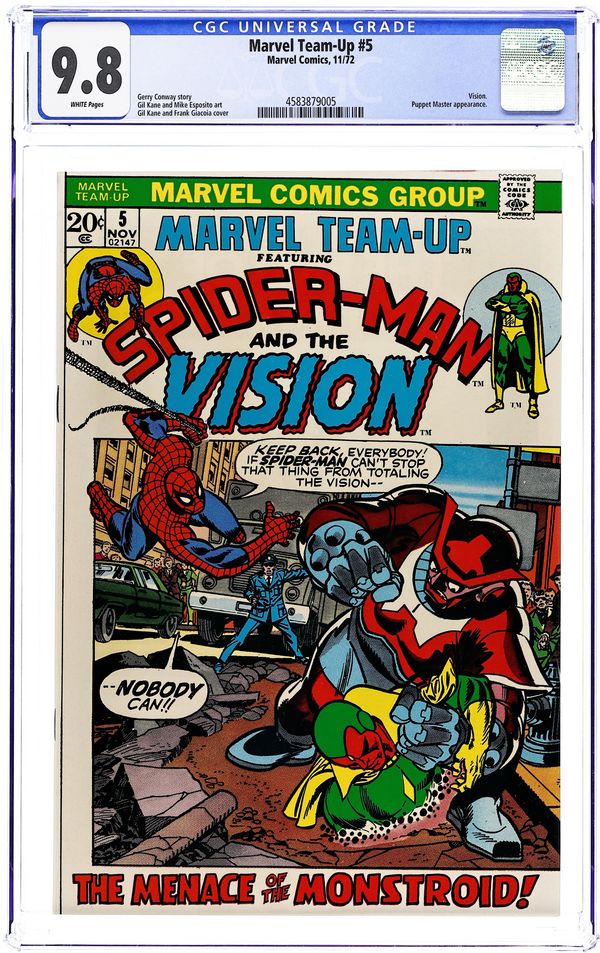 "A Passion of the Mind!" Guest-starring Spider-Man and the Vision. Script by Gerry Conway. Pencils by Gil Kane. Inks by Mike Esposito. Cover by Gil Kane and Frank Giacoia. While web-slinging across Manhattan, Spider-Man discovers a man stumbling in the streets below. And to the wall-crawler's surprise...it's the Vision! What's wrong with the synthezoid avenger? It appears that an electromagnetic signal from the Baxter Building is interfering with the Vision's brain waves! So, the two heroes travel to the FF's headquarters -- where they find the signal and the Puppet Master! Cameo appearance by Harry Osborn. (Note: The Puppet Master previously appeared in Fantastic Four 100.) 36 pages. Cover price $0.20.