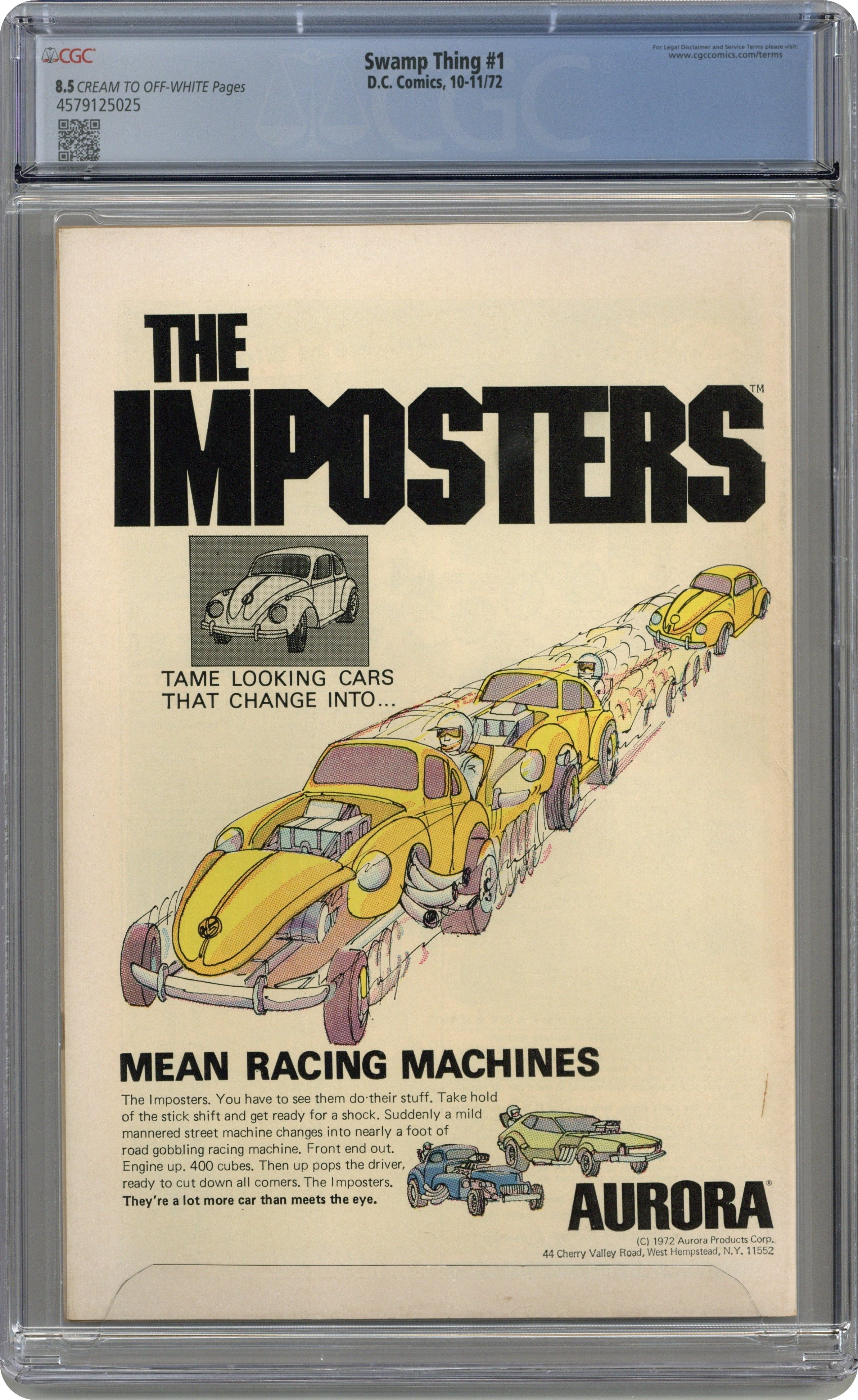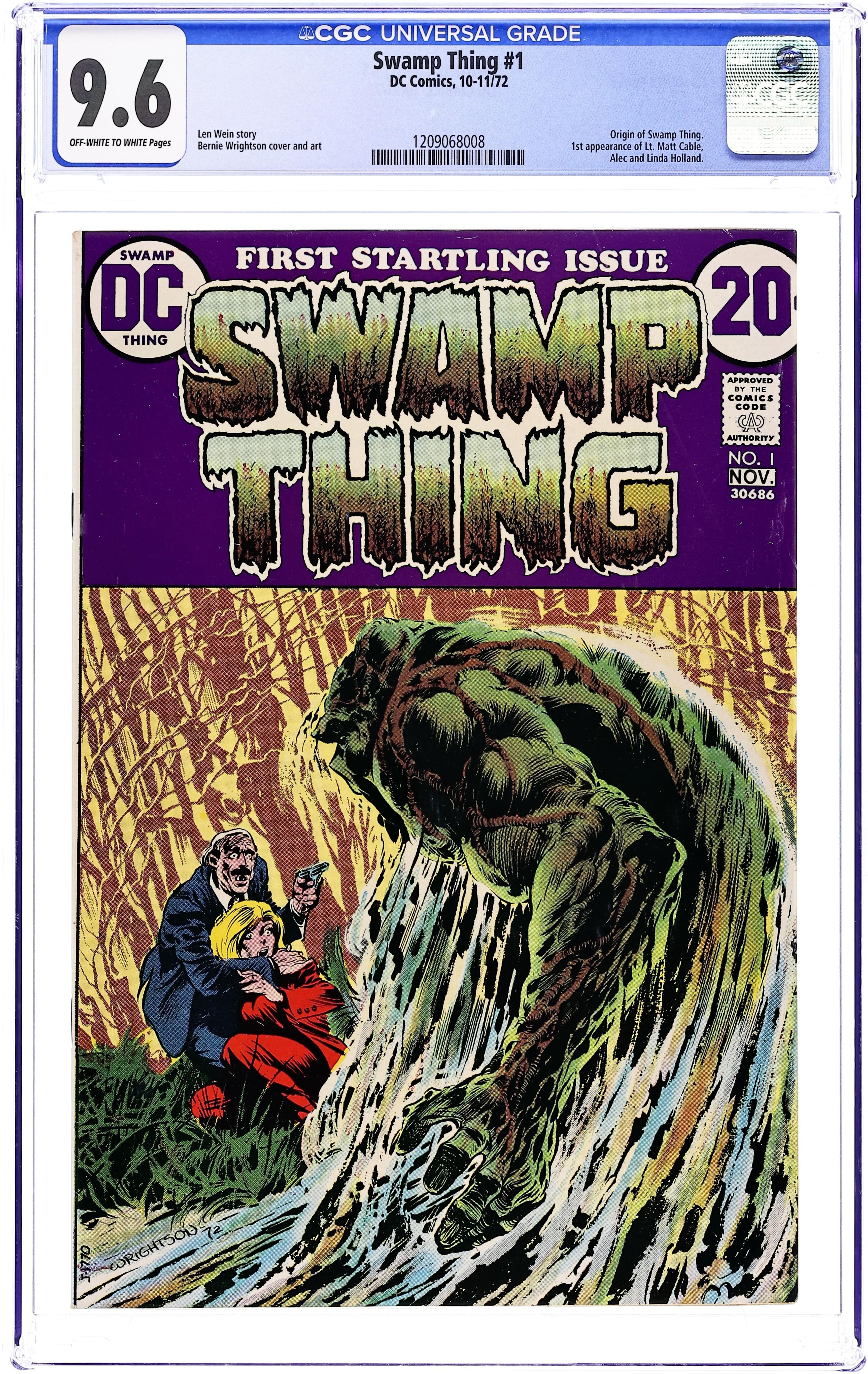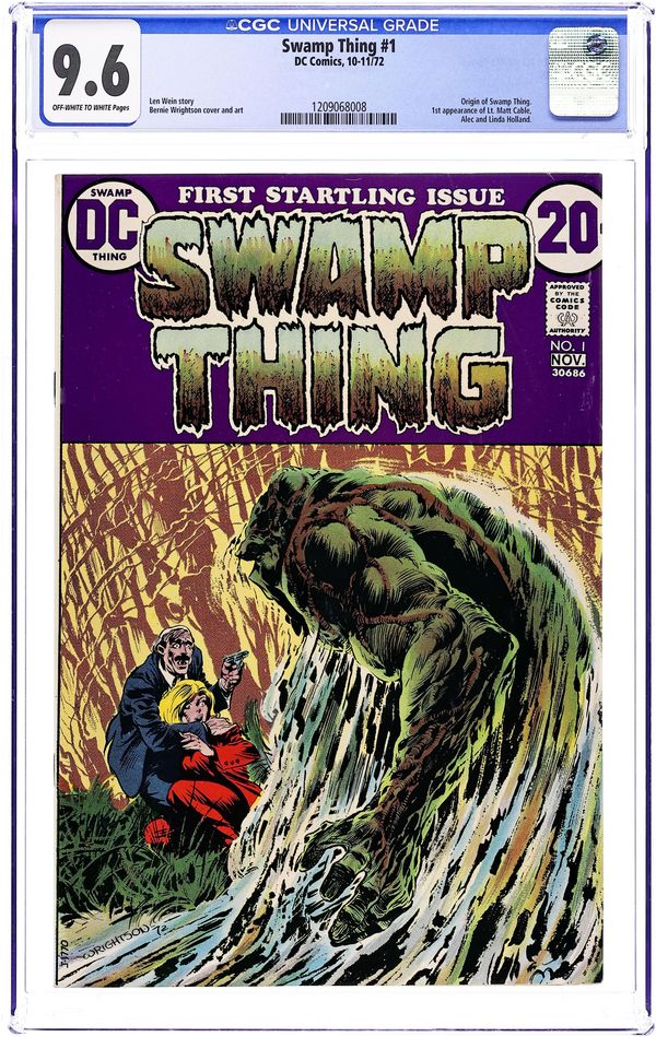 "Dark Genesis." While working on a restorative formula (that can make forests out of deserts) in the Louisiana swamps, scientist Alec Holland is killed by a bomb set off by Mr. E., who wants the formula. Shortly thereafter, a humanoid plant being rises from the swamp, created from the body of Holland, the chemicals in the formula, and the strange forces in the swamp. 1st appearance of Alec and Linda Holland. 1st appearance of Matt Cable. (Swamp Thing himself first appeared in House of Secrets 92). Script by Len Wein, art and cover by Berni Wrightson. Includes brief bios of Wein and Wrightson. Cover price $0.20.