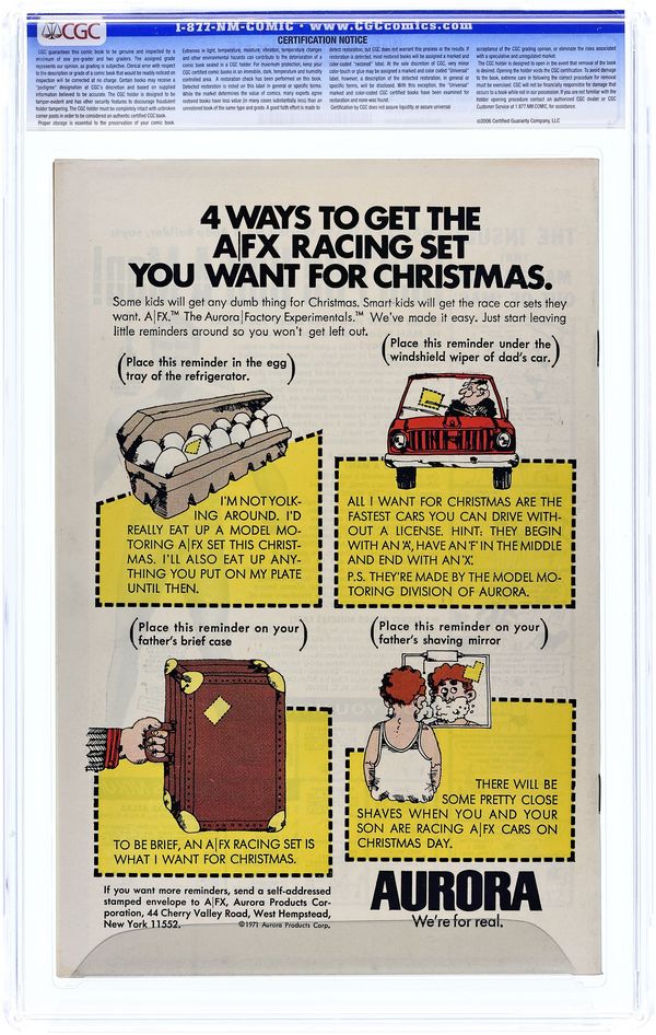 Cover art by Bernie Wrightson. "Waiting... Waiting... Waiting...", script by Sheldon Mayer, art by Rico Rival; A gambler who gets involved with a scientific project to recreate Earth history in simulation hopes to view the winner of the next atomic war, but the lab is destroyed before he can learn of the victor. "No Bed of Roses," script by John Albano, art by Jack Sparling; A man frames another man so that he can marry his wife when he is sent to prison; In prison, the convicted man hangs himself and leaves a note that he hopes to reincarnate in order to seek revenge and get his wife back; He reincarnates into a gorilla and escapes the zoo to tear apart the man who married his wife. "The Village on the Edge of Forever," script by Steve Skeates, art by Alex NiƱo; After the radiation of a future war has destroyed humanity, a sole survivor builds lifelike robots for company; One of the machines, believing itself to be human, seeks out other humans and finds a girl under attack by mutants; He tries to save her and during the fight his arm is damaged and he realizes that he is a robot. Cain & Abel cartoon page by Sergio AragonƩs. 36 Pages, Full Color. Cover price $0.20.