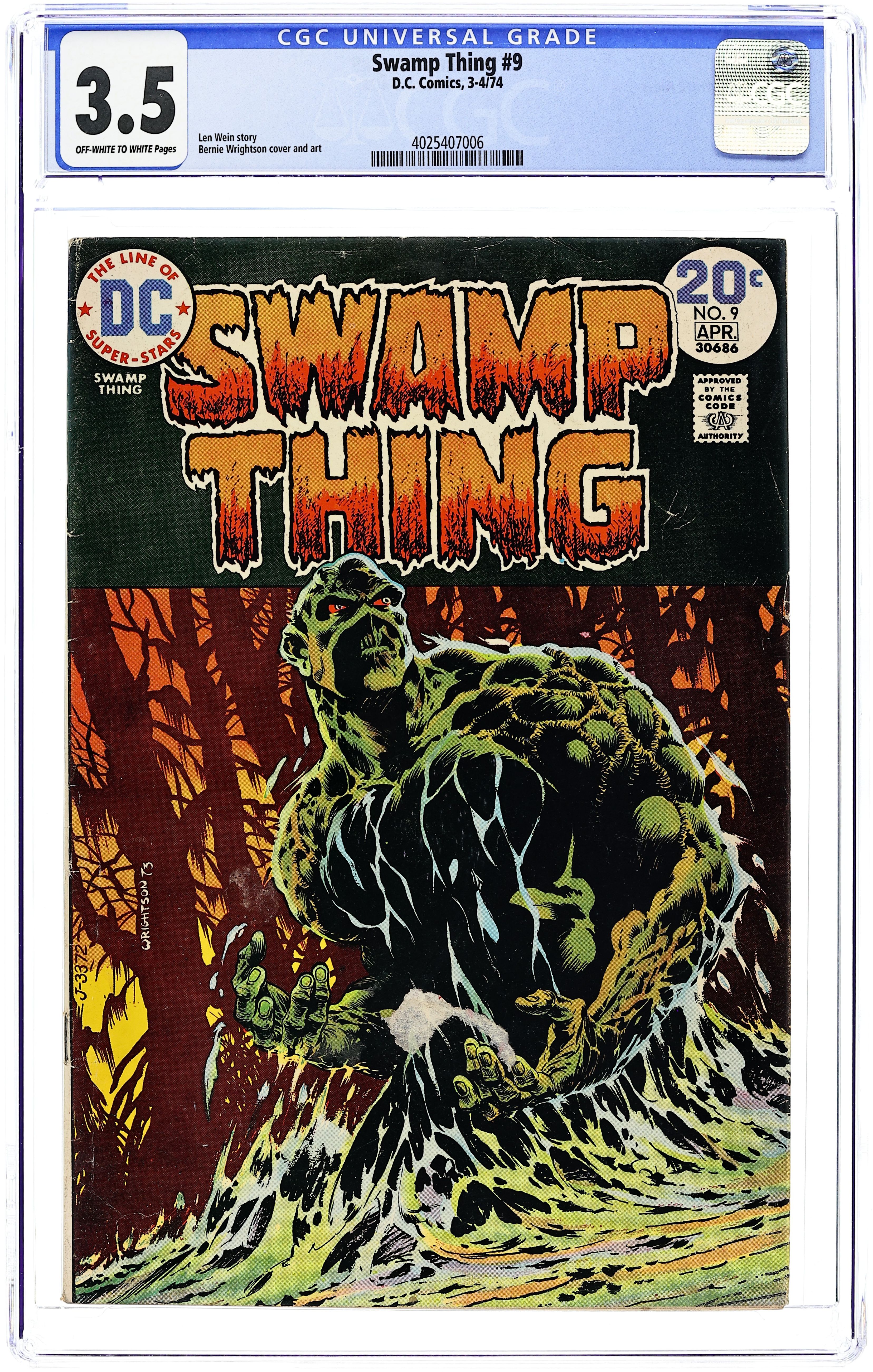 "The Stalker From Beyond." Swamp Thing sneaks aboard a train to the Louisiana swamp where he was "born." However, he is unaware that an alien has landed there to repair its spaceship. Script by Len Wein, pencils by Berni Wrightson, inks by Wrightson and Mike Kaluta. Cover by Wrightson. Cover price $0.20.