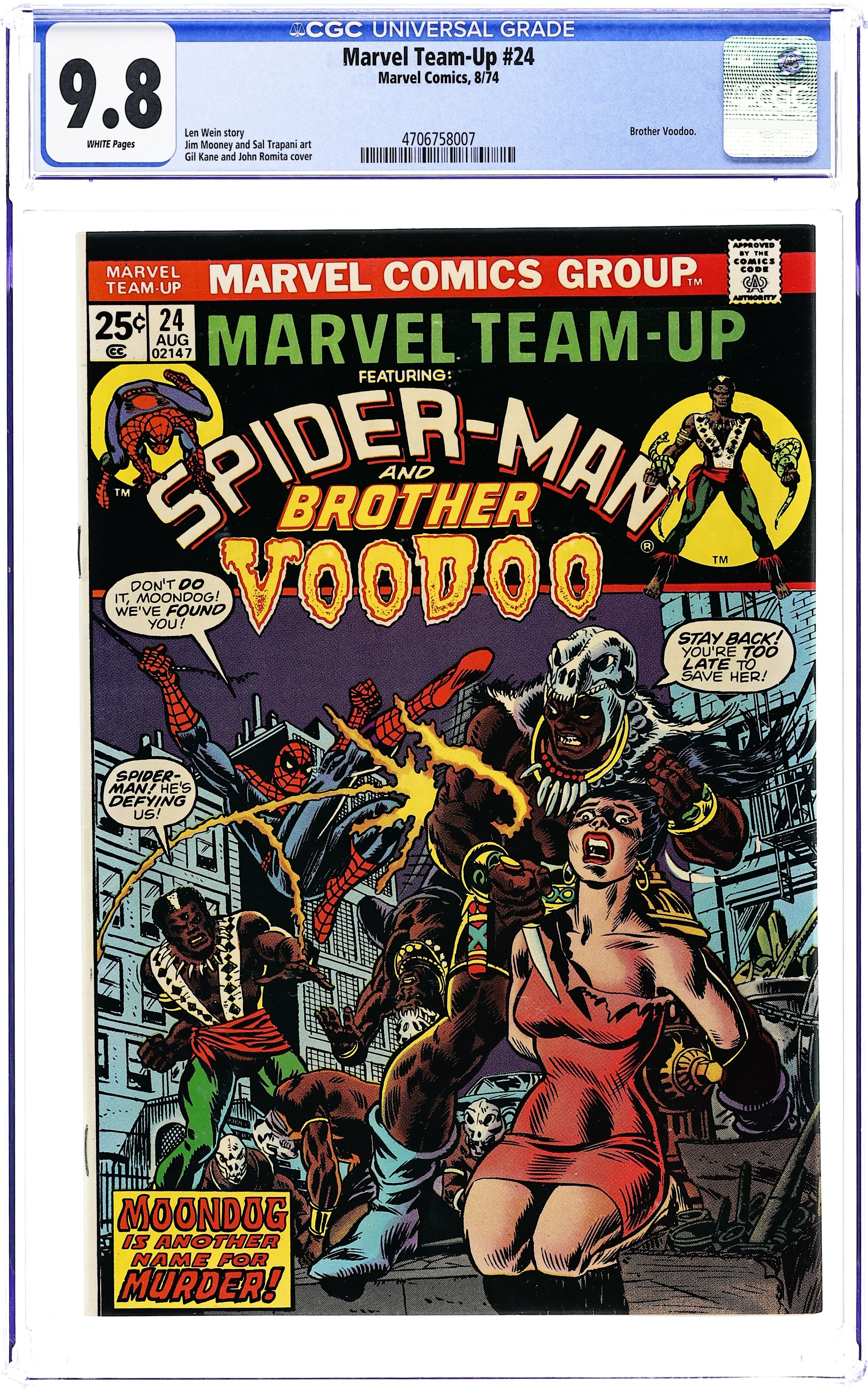 "Moondog is Another Name for Murder!" Guest-starring Spider-Man and Brother Voodoo. Script by Len Wein. Pencils by Jim Mooney. Inks by Sal Trapani. Cover by Gil Kane and John Romita. Spider-Man gets mixed up in a supernatural slugfest between Moondog and Brother Voodoo! (Note: The letters page contains Marvel Value Stamp Series A #90 Hercules.) 36 pages. Cover price $0.25.