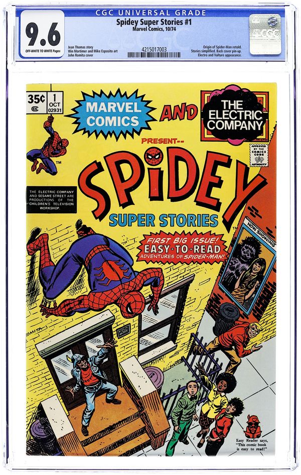 Starts Apr 4 Simplified Spider-Man stories. 11 page origin story, "Spider-Man is Born!" Script by Jean Thomas (with help from Bill Effros, based on the original story by Stan Lee), pencils by Winslow Mortimer, inks by Mike Esposito. Also in this issue: "Spidey Signs Up," "Spidey Meets the Spoiler" (based on the Electric Company script by Tom Whedon), and "Help! I'm Spider-Man!" (based on a story by Byron Preiss). John Romita Sr. cover. Cover price $0.35.