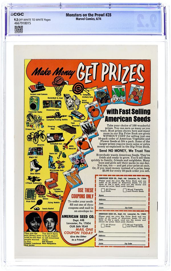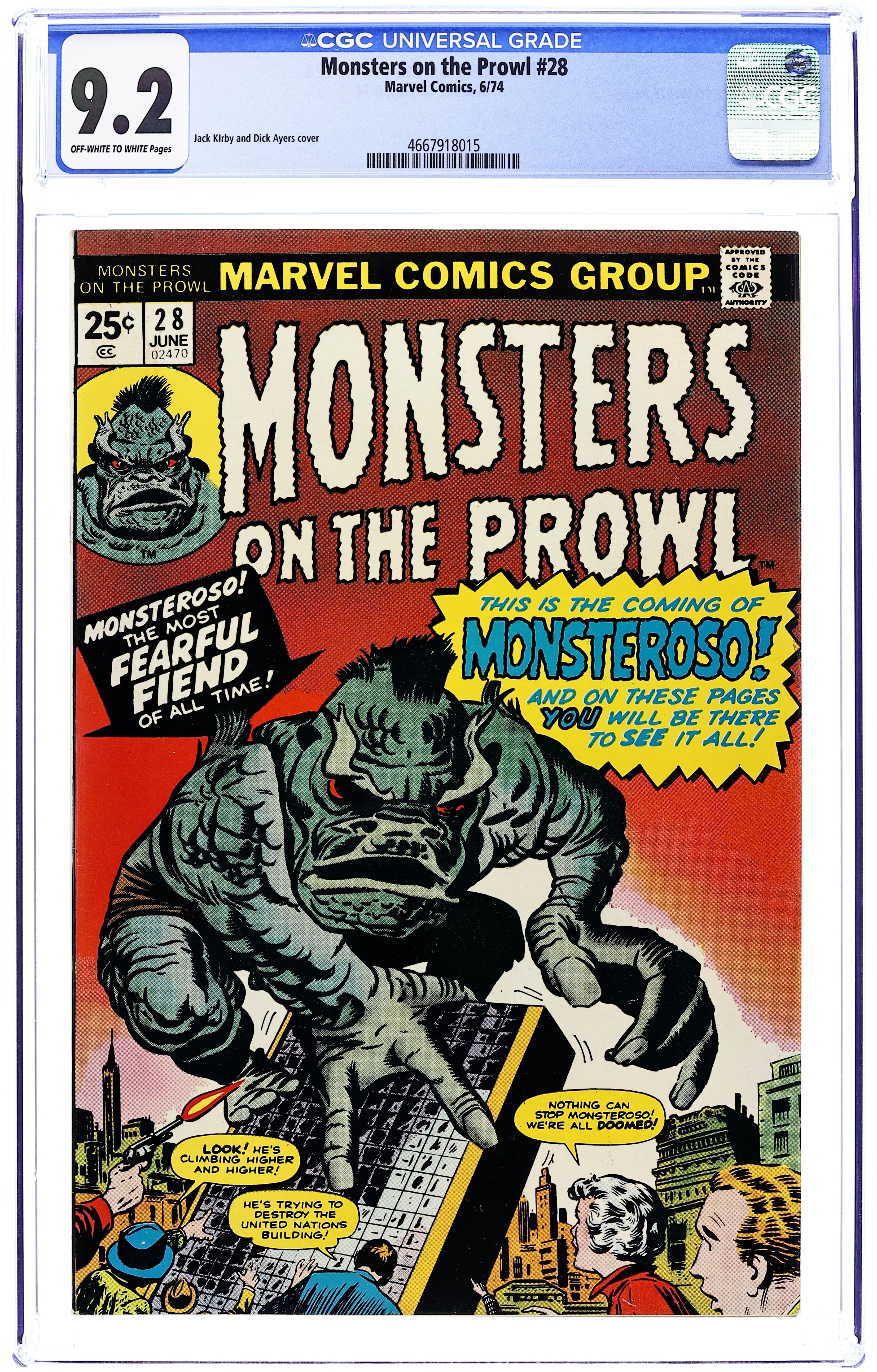 Cover pencils by Jack Kirby and Steve Ditko (lower right foreground figure), inks by Dick Ayers and Steve Ditko (lower right foreground figure). The Escape of...Monsteroso!, pencils by Jack Kirby, inks by Dick Ayers; A circus owner finds a dead alien in Africa and brings it to the United States for a museum; The alien turns out to be alive, and then goes on a rampage. They're Driving Me Crazy!, pencils by Dick Ayers, inks by Ernie Bache; This story postulates that the people of Earth are in reality the slaves of beings from another dimension who control all thought that people are allowed to have; When an occasion savant arises that produces knowledge the masters don't want people to have, that individual is made nonexistent. 36 pgs. $0.25. Cover price $0.25.