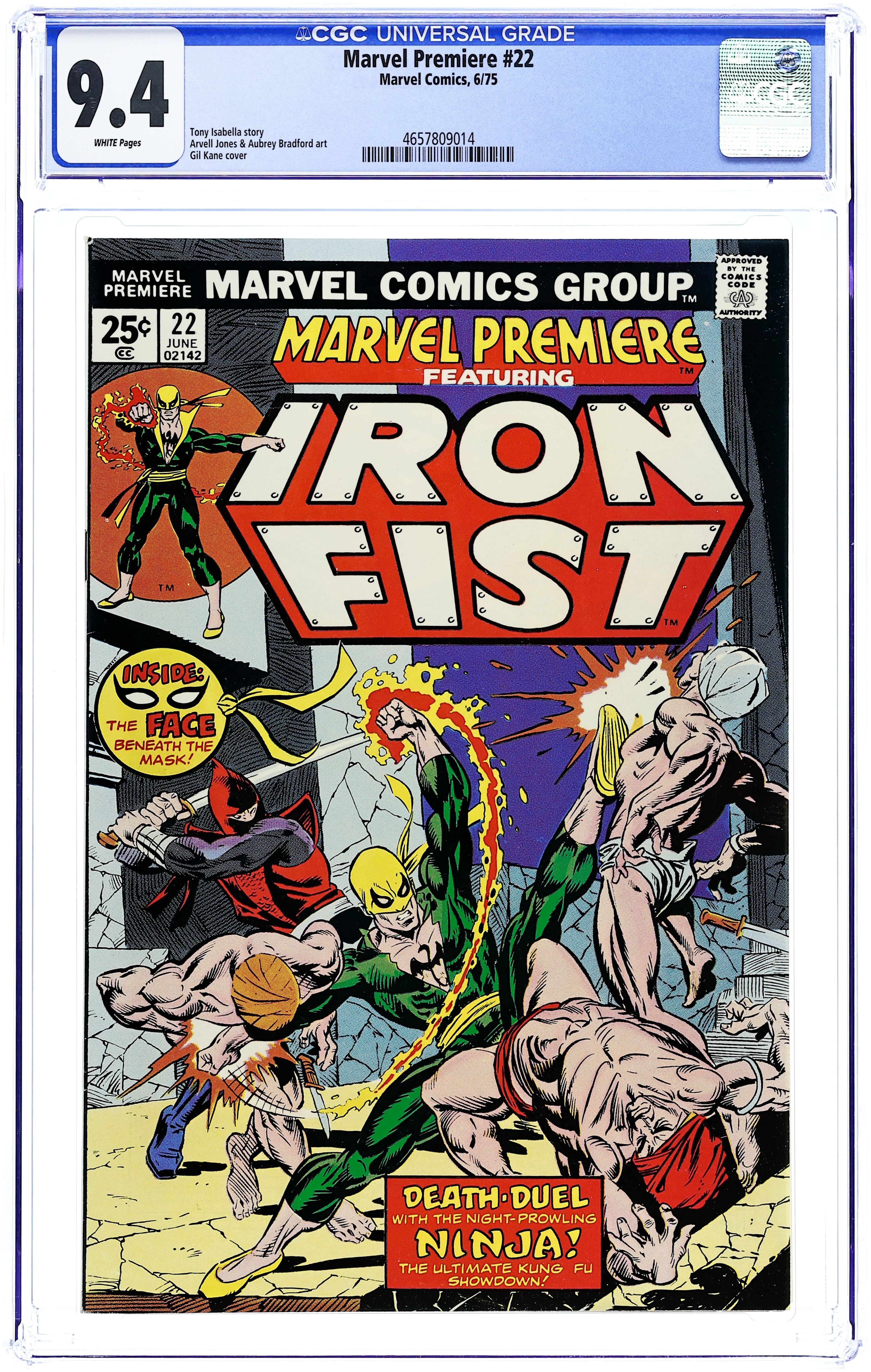 Cover pencils by Gil Kane. Death Is a Ninja, script by Tony Isabella, pencils by Arvell Jones, inks by Aubrey Bradford; The Ninja transports Iron Fist to a mystic dimension where they can battle to the death in peace; He regales Danny with his origin story, his ties to K'un-Lun and how he was trapped in the Sacred Volume of Kali for many years; Iron Fist destroys the Ninja and returns to Earth to find the police mopping up the Kara-Kai death cult; Danny is cleared of Harold Meachum's death but feels lost as his vengeance against his parents' murderer is complete and he cannot return home to K'un-Lun for nine more years; 1st appearance of Master Khan. Letter to the editor from comics writer Ralph Macchio. 36 pgs. $0.25. Cover price $0.25.