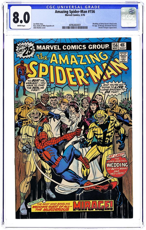 Ends Dec 8 7:18 PM CST Bid History 4 bids Current Bid $16 Your Secret Max Bid If you'd like to bid, please log in or register. "On a Clear Day, You Can See...The Mirage!" Script by Len Wein. Pencils by Ross Andru. Inks by Mike Esposito and Dave Hunt (backgrounds). Cover by John Romita. Wedding bells ring in the pages of the Amazing Spider-Man! As Peter's former girlfriend (Betty Brant) and the web-slinger's future foe (Ned Leeds aka the Hobgoblin) tie the knot! The joyous ceremony proceeds as planned until a wedding crasher shows up! The Mirage! And he's not just looking for free hors d'oeuvres! Can the wall-crawler see through the Mirage and restore Betty and Ned's happy day? First Appearance of the Mirage. Appearances by Aunt May, Anna Watson, Mary Jane Watson, Flash Thompson, Harry Osborn, Liz Allan, J. Jonah Jameson, Joe Robertson, and Doctor Octopus. (Notes: The Mirage appears next in Marvel Two-in-One 96. The letters page includes Marvel Value Stamp series B #83 the Incredible Hulk. This story was reprinted in Marvel Tales 133. A 30-cent cover price variant exists for this issue.) 36 pages. Cover price $0.25.