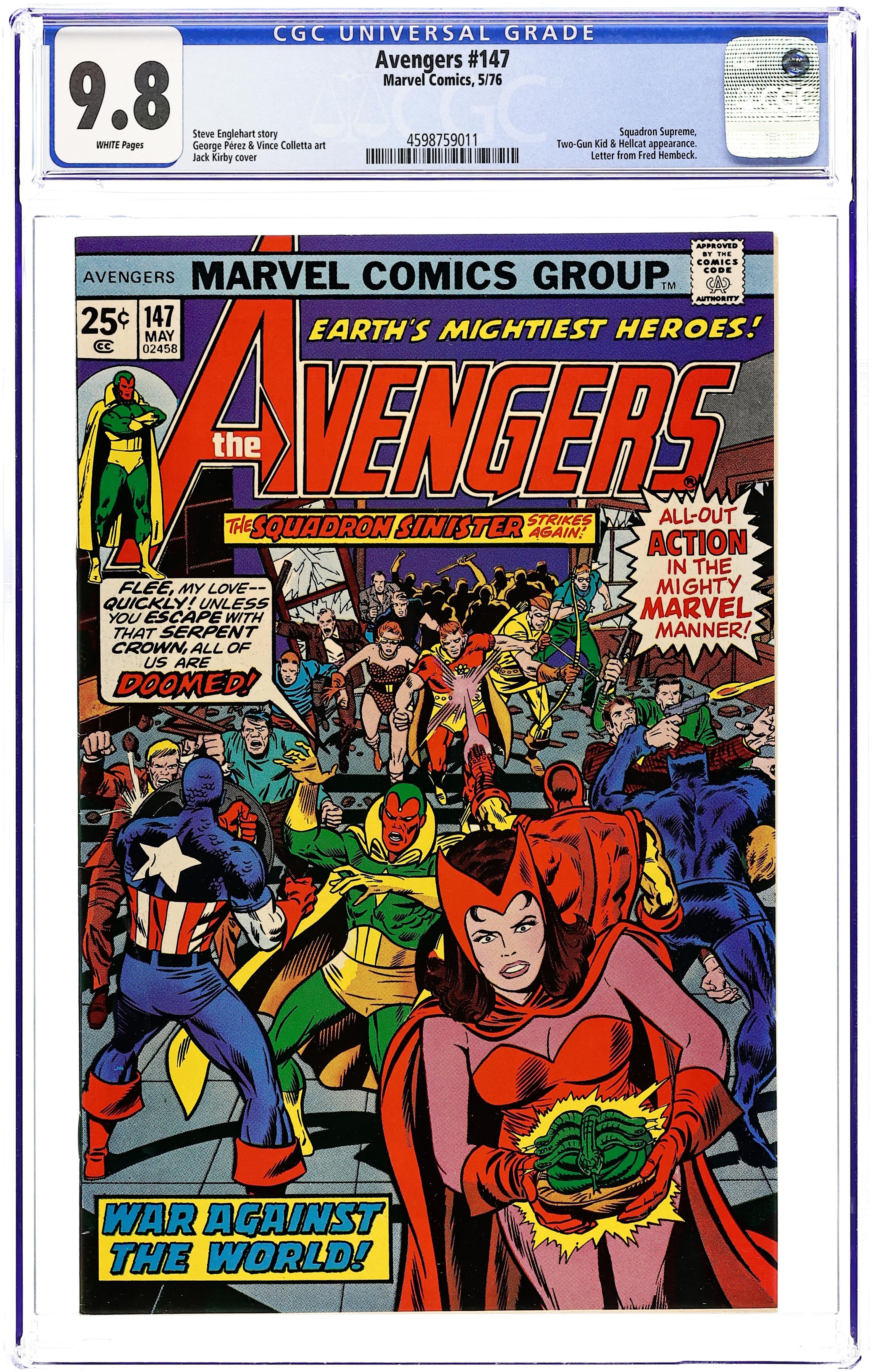 Crisis on Other-Earth!" Part 5 of 7. Script by Steve Englehart. Pencils by George Perez. Inks by Vince Colletta. Cover by Rich Buckler and Dan Adkins. Story continues from Avengers 144 (part 4). In stunning fashion Hugh Jones has transported both the Avengers and the Squadron Supreme back to the Squadron's home world! Where none other than Nelson Rockefeller is the President! However, the President is wearing something very troubling on his head...the Serpent Crown! Realizing the evil of the crown, the Vision steals it from President Rockefeller, and the Avengers quickly escape into the streets. But the serpent crown is powerful indeed and begins to exert influence on the avenger who's carrying it...the Scarlet Witch! Unfortunately, Wanda falls prey to the crown's mental onslaught and then falls into the hands of the Golden Archer, Lady Lark, and Hyperion. But what happens next...may be the synthezoid avenger's finest hour! As the Vision puts on an incredible display of his powers vs. the Squadron Supreme! A classic issue for the fans of the Vision and the Scarlet Witch! Cameo appearances by Hawkeye, Moondragon, Thor, and the Two-Gun Kid. Flashback cameos by Nomad and the Serpent Squad to recap the events of Captain America 181. (Notes: The letters page includes a letter from comics cartoonist Fred Hembeck. The letters page also contains Marvel Value Stamp Series B #76 the Hulk. A 30-cent cover price variant exists for this issue.) 36 pgs. Cover price $0.25.