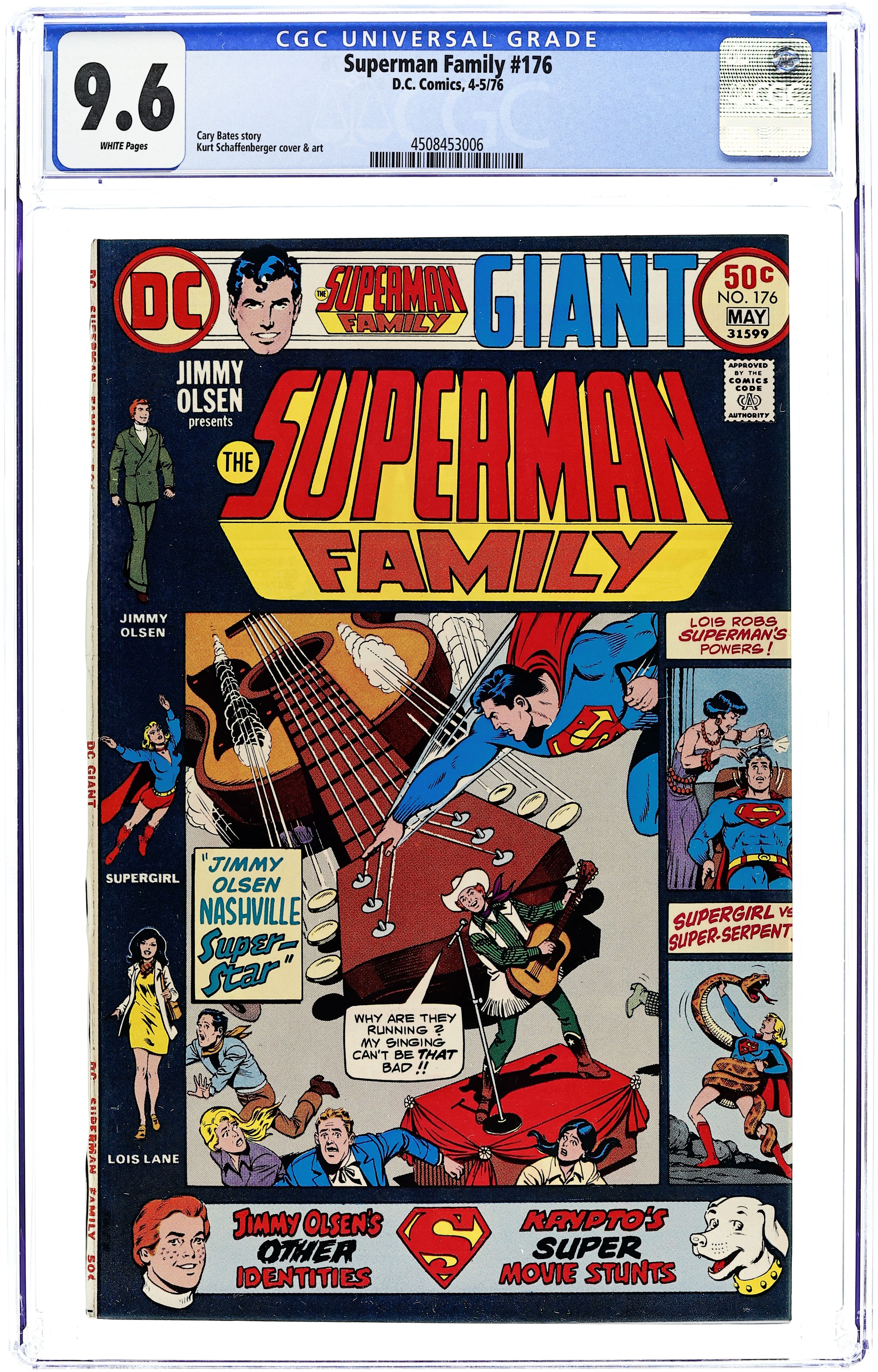 Cover art by Kurt Schaffenberger. Twinkieless Gotham City Hostess Twinkies ad, pencils by Curt Swan, inks by Vince Colletta. Jimmy Olsen, Nashville Super-Star, script by Cary Bates, art by Kurt Schaffenberger; When country music signer Red Tucker is killed in a plane crash, Jimmy travels to Nashville to uncover the details of his friend's death. Justice for All Includes Children public service announcement starring Superman, pencils by Neal Adams. I Betrayed Superman starring Lois Lane, script by Robert Kanigher, art by Irv Novick. Linda Danvers -- Movie Star! starring Supergirl, script by Leo Dorfman, art by Kurt Schaffenberger. Krypto's Super-Movie Stunts!, script by Otto Binder, art by Al Plastino. 68 pgs. $0.50. Cover price $0.50.