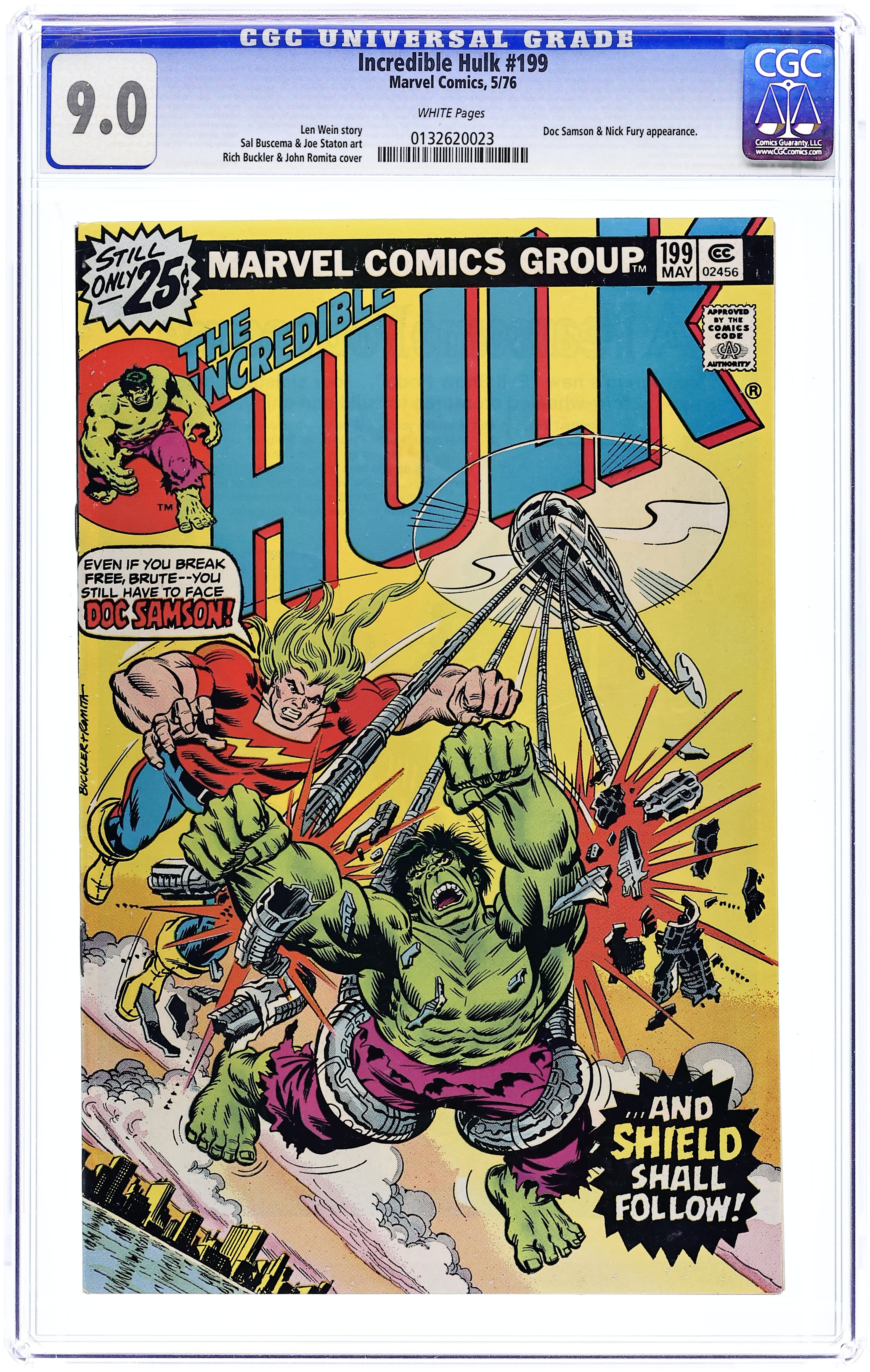 The Hulk must first contend with Samson "...and S.H.I.E.L.D. shall Follow!" Guest-starring Doc Samson. Nick Fury cameo. Story by Len Wein. Art by Sal Buscema and Joe Staton. The Hulk must once again battle the mighty Doc Samson (they have fought most recently in Hulk #141 and #193). But, this time the good doctor has not come alone. 36 pages. Includes a Marvel Value Stamp of Conan the Barbarian. Cover price $0.25.