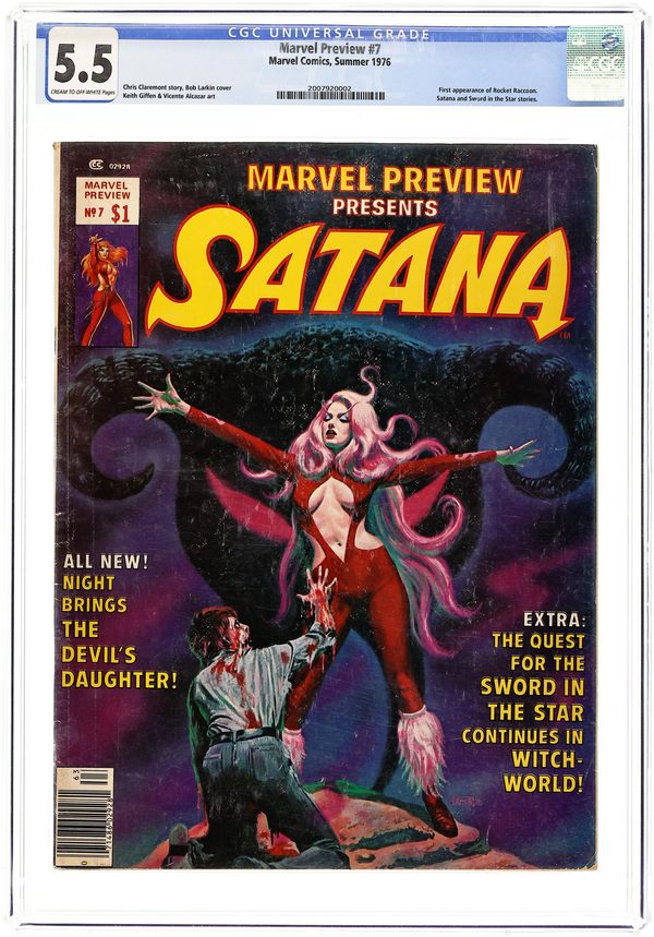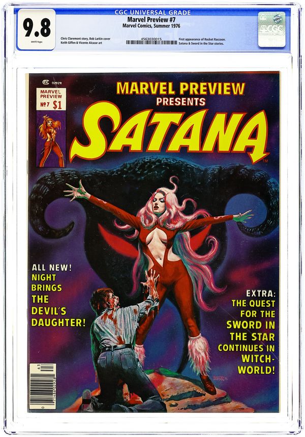 1st app. Rocket Raccoon. Cover art by Bob Larkin; Satana illo by Vicente Alcazar; Why a Devil's Daughter? article by John Warner; The Damnation Waltz Satana story by Chris Claremont, art by Vicente Alcazar; Part II: La Simphonie Diable—The Devil's Symphony Satana story by Claremont, art by Alcazar; From the Devil, a Daughter article by Claremont, art by Michael Netzer and Esteban Maroto; Just a Little Over a Year Ago… article by Bill Mantlo, art by Terry Austin; and The Sword in the Star!: Stave 2: Witchworld! story by Mantlo, 1st professional art by Keith Giffen. Cover price $1.00.