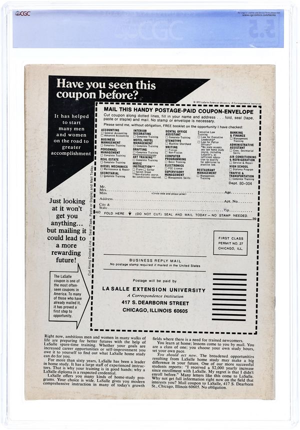 Part 2 of 3 - "Union Jack is Back!" Written by Roy Thomas. Art by Frank Robbins and Frank Springer. Even the Invaders, the greatest heroes of World War II, are powerless before the vampiric powers of Baron Blood. Only Union Jack, a masked avenger from the days of World War I, can save them now. But what is the mysterious connection between Union Jack and the vampire Nazi sympathizer. 32 pages FC Cover price $0.30.