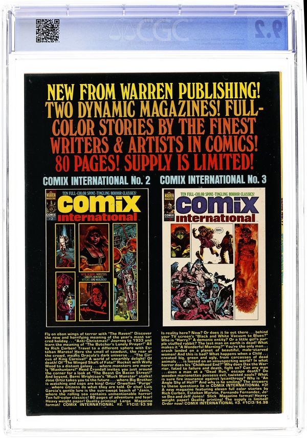 Stories in this issue include: Within You...Without You by Bruce Jones and Richard Corben; Moonweavers: The Gift by Budd Lewis and Leopold Sanchez; Demons of Nob Hill by Bill DuBay and Jose Ortiz; The Demons of Father Pain by Bill DuBay and Jose Ortiz (with color by Peggy DuBay); Oogie and the Lie by Bill DuBay and Esteban Maroto; Cronk: and Stalker in the Maze by Nick Cuti, Carmine Infantino, and Wayne Howard. Cover art by Richard Corben. Cover price $1.25.