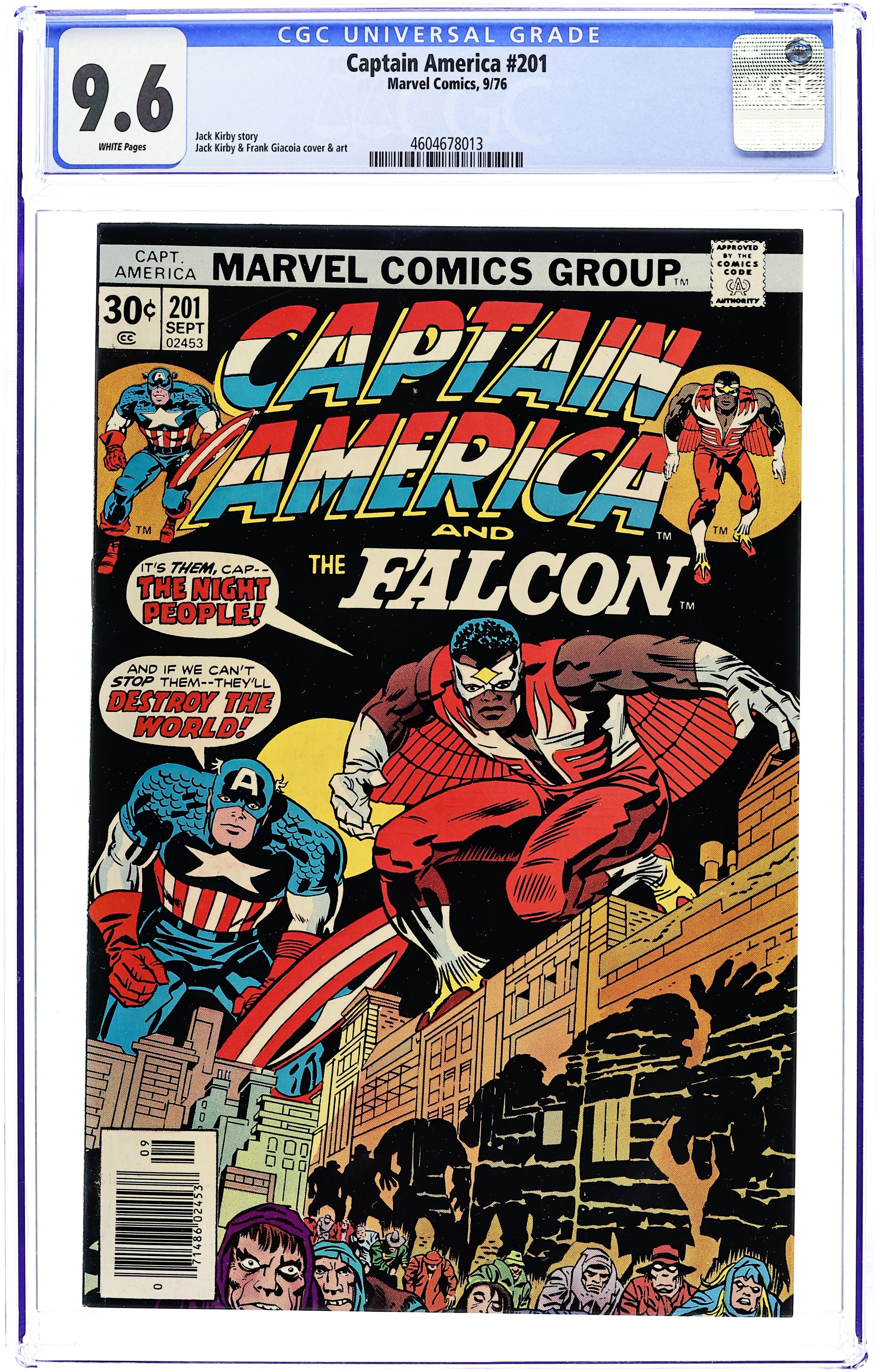 "The Night People!" Part 1 of 3. Script by Jack Kirby. Pencils by Jack Kirby. Inks by Frank Giacoia. Cover by Jack Kirby and Frank Giacoia. The Madbomb ordeal is over, and the U.S.A. remains the land of the free! Steve Rogers and Sam Wilson look forward to returning to New York and resuming their personal lives. But something very strange has been going on in the Big Apple, while the two heroes were away. The Night People emerged! Who? A bizarre group of people that commit burglaries and robberies throughout the city during the night. The Falcon doesn't think the Night People actually exist...until they kidnap Leila Taylor! And then Captain America and the Falcon's next adventure begins! First appearances of Texas Jack Muldoon, Brother Wonderful, and Brother Inquisitor. Cameo appearance by Mason Harding. First 30¢ cover price. 36 pages. Cover price $0.30.